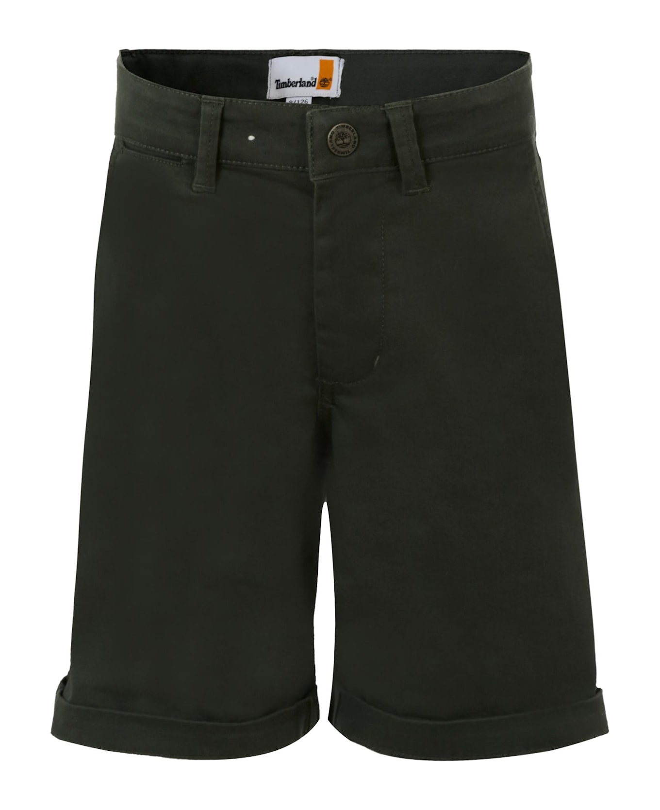 Green cotton twill shorts with belt loops, zip and snap button front fastening, side pockets, back pockets and cuffed hem; adjustable waist with internal elastic with buttons, up to 10 years. They are embellished with a logo patch on the back.