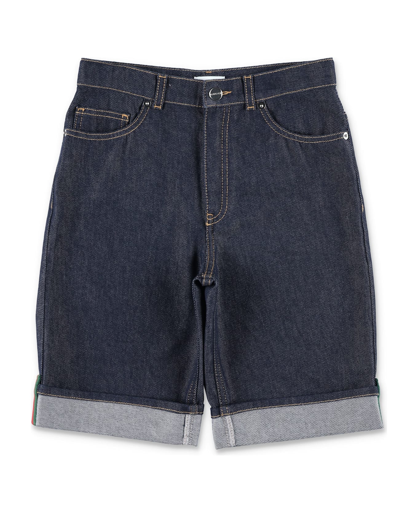 These Gucci Denim Shorts For Boys Feature A Classic Five-pocket Design, Metal Button Closure, Belt Loops, And A Zip Fly. The Cuffed Hem Showcases The Signature Web Stripe, Adding A Distinctive Designer Touch. Dark Blue Denim