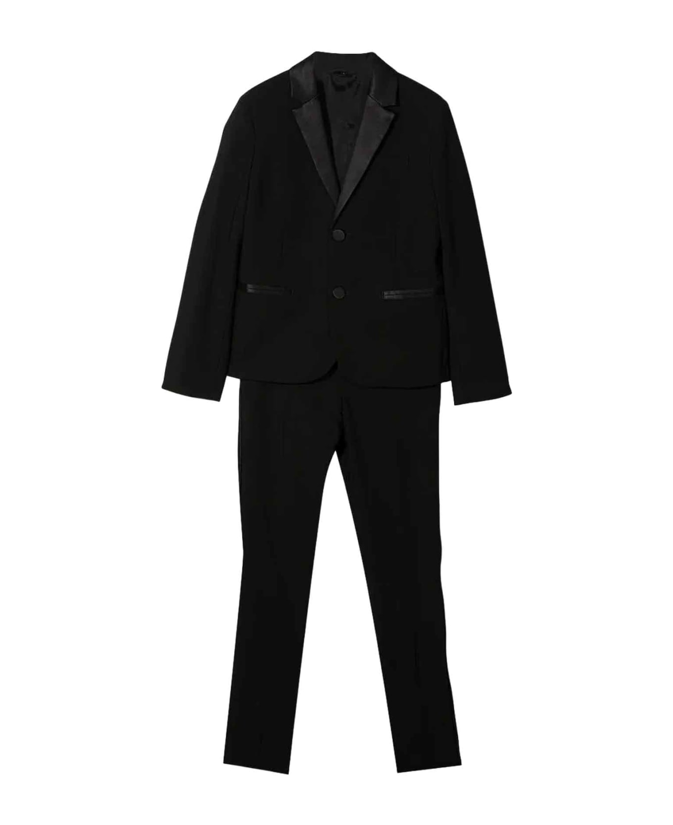 Black suit boy. Notch lapels, front button fastening, long sleeves, buttoned cuffs, two front welt pockets, medium rise, concealed front fastening, two side slanted pockets, two back welt pockets, straight fit and ankle length. Mulberry Silk 100%, Viscose 64%, Polyester 36%