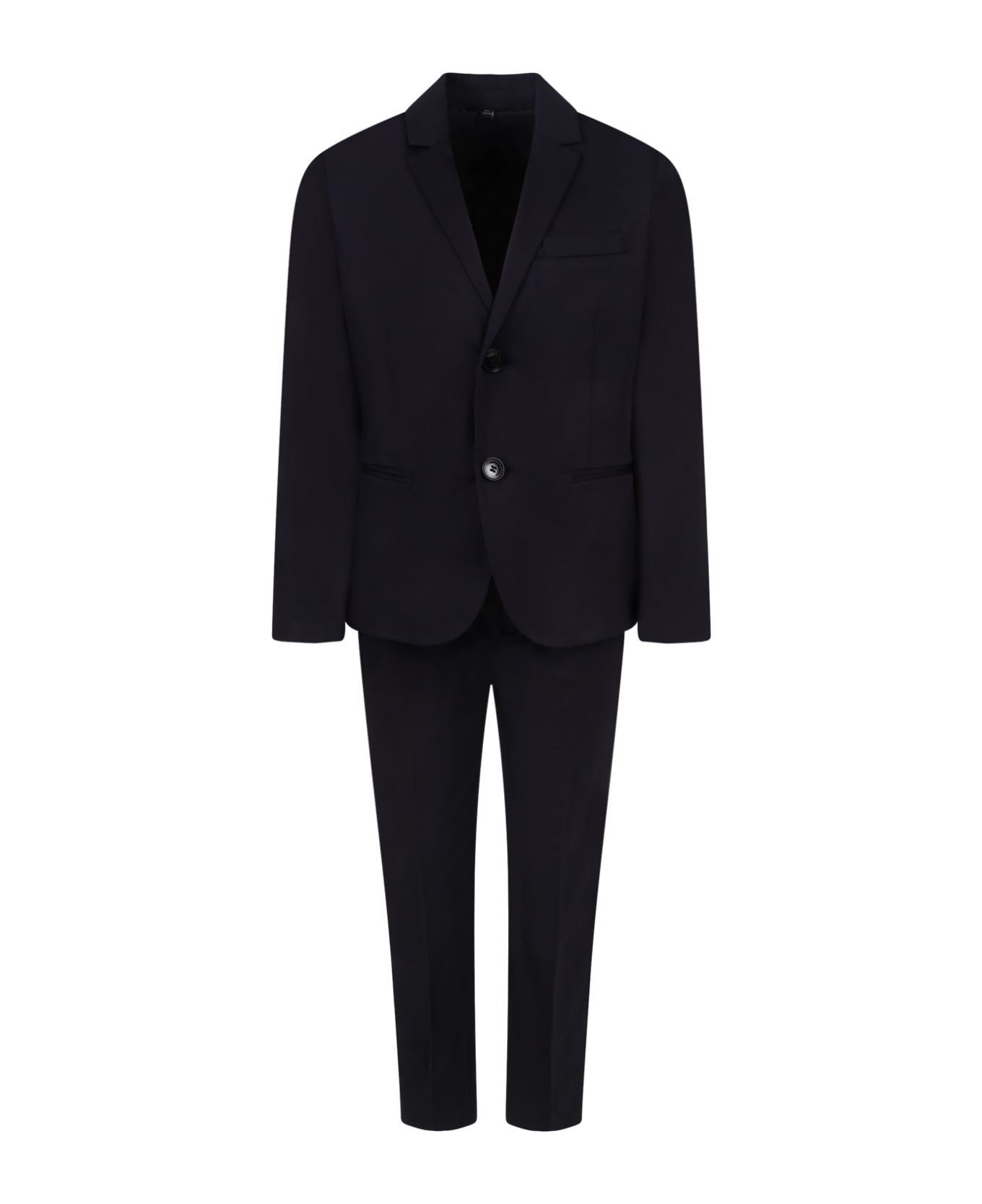 Blue suit, composed wih jacket and trouser; jacket with buttoned closure, side slit pockets, chest pocket and slit on the back; trousers with straight leg, front fold, zipped and buttoned closure, adjustable waist thanks to inside elastic with buttons, belt loops, side pockets and pockets with button on the back. They are embellished with iconic eagle and logo.