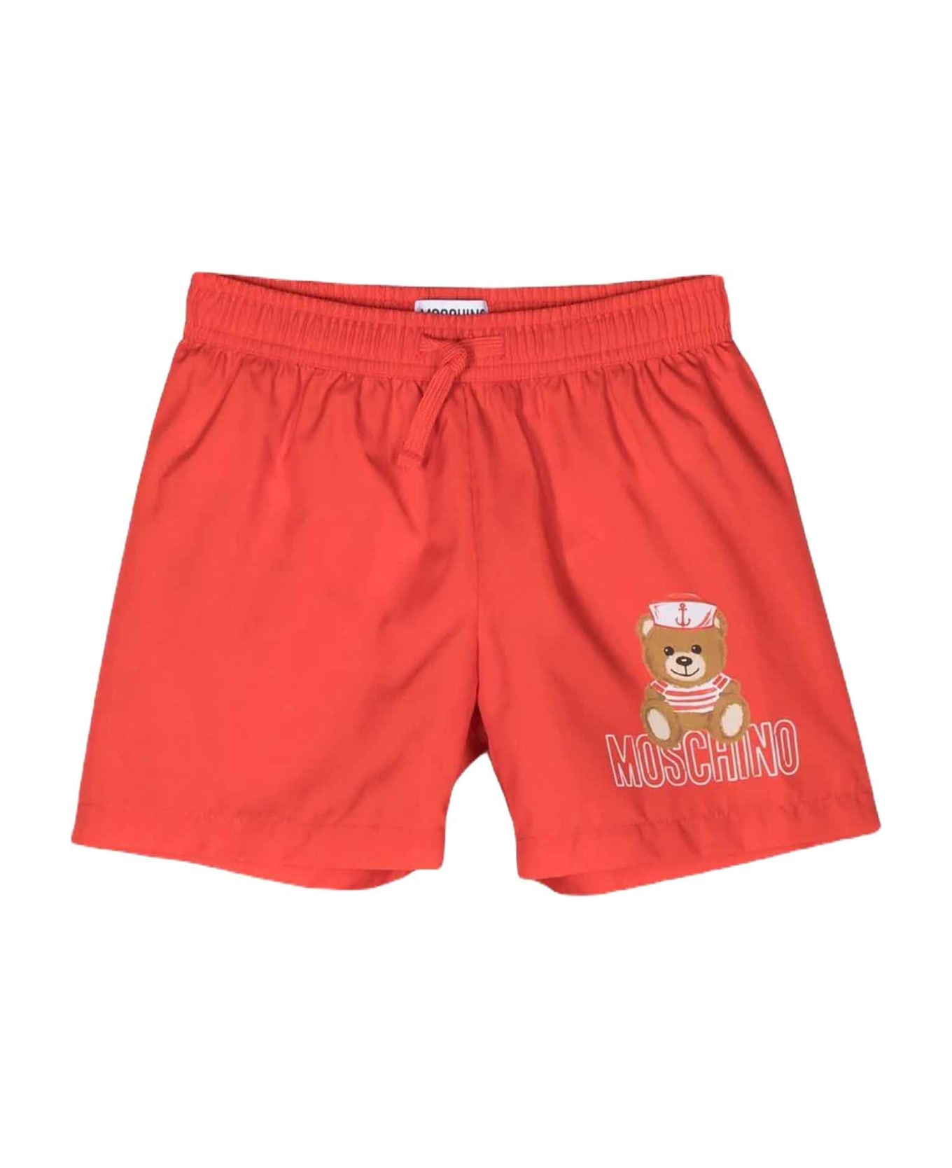 Red swimsuit boy. Teddy bear print, drawstring waist and wide leg fit. 100% polyester