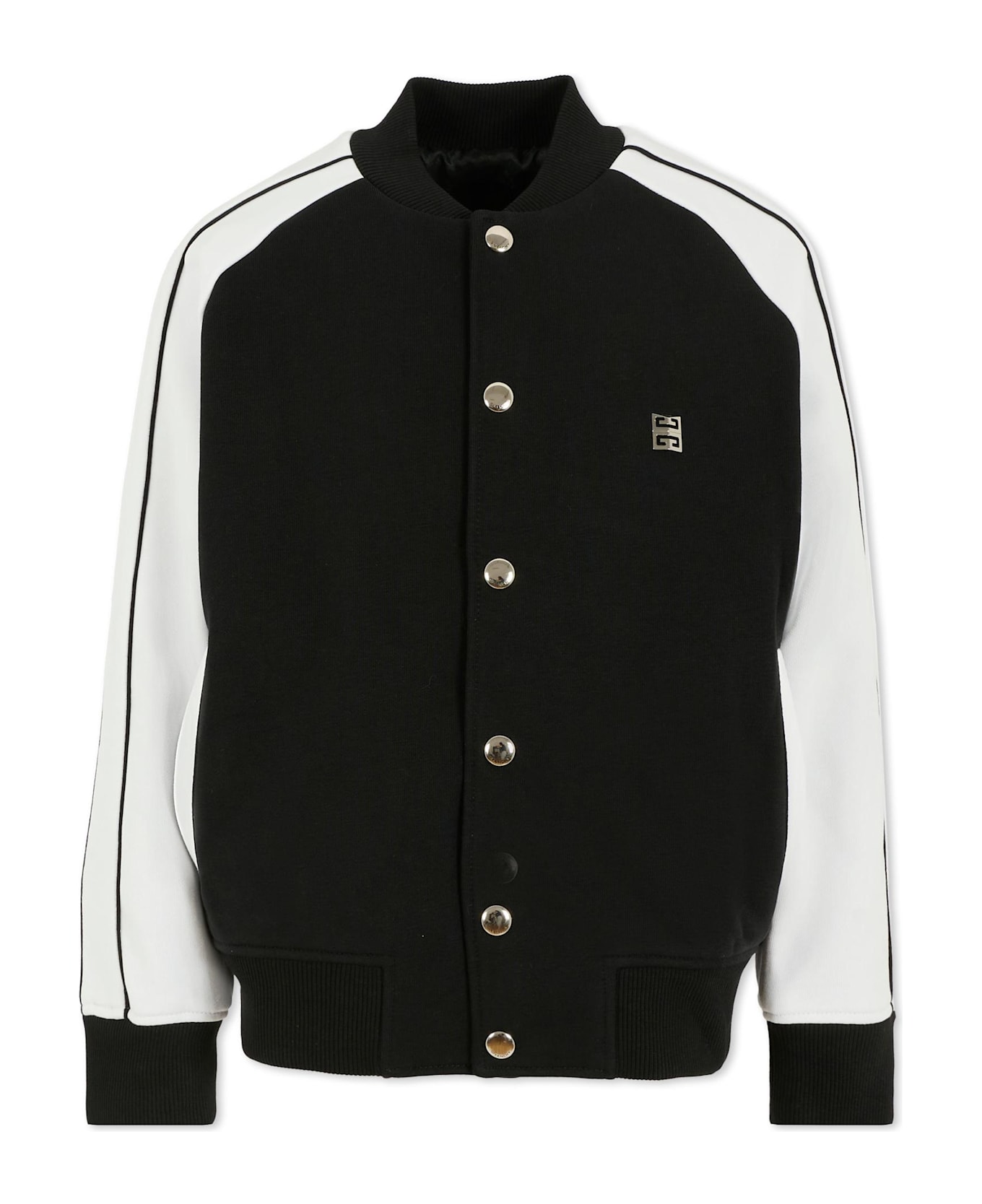 Black bomber jacket from Givenchy Kids, in lightweight fabric, with long contrasting white sleeves, a low ribbed collar, a front snap closure, side pockets, and ribbed cuffs and hem. It is embellished with the iconic 4G metal motif on the chest and the Maison Givenchy Paris signature embroidered on the back.