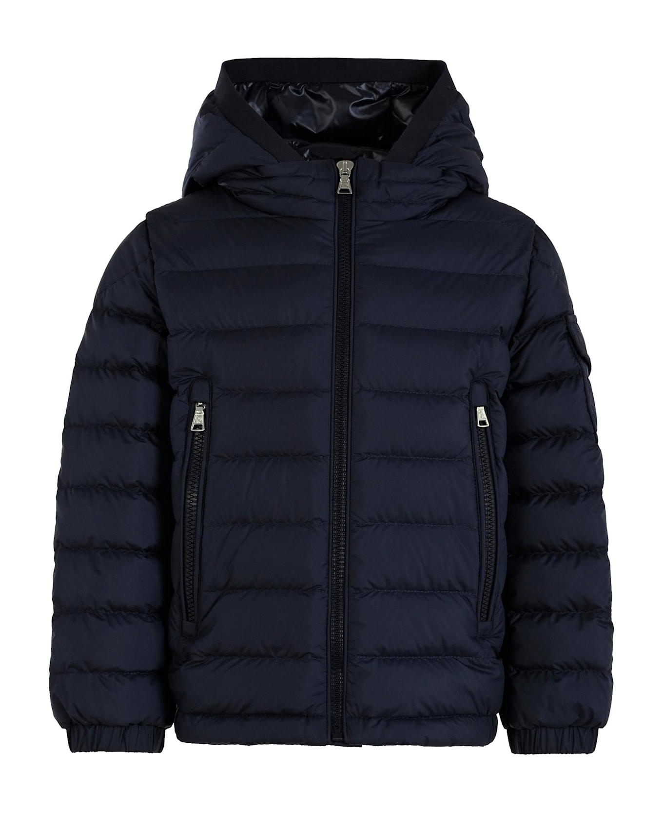 Blue 100 gram down jacket from the luxury brand Moncler Kids, padded and quilted, with long sleeves, hood, front zip fastening, side zip pockets, sleeve pocket, elasticated cuffs and hem. It is embellished with an iconic logo patch applied on one sleeve.