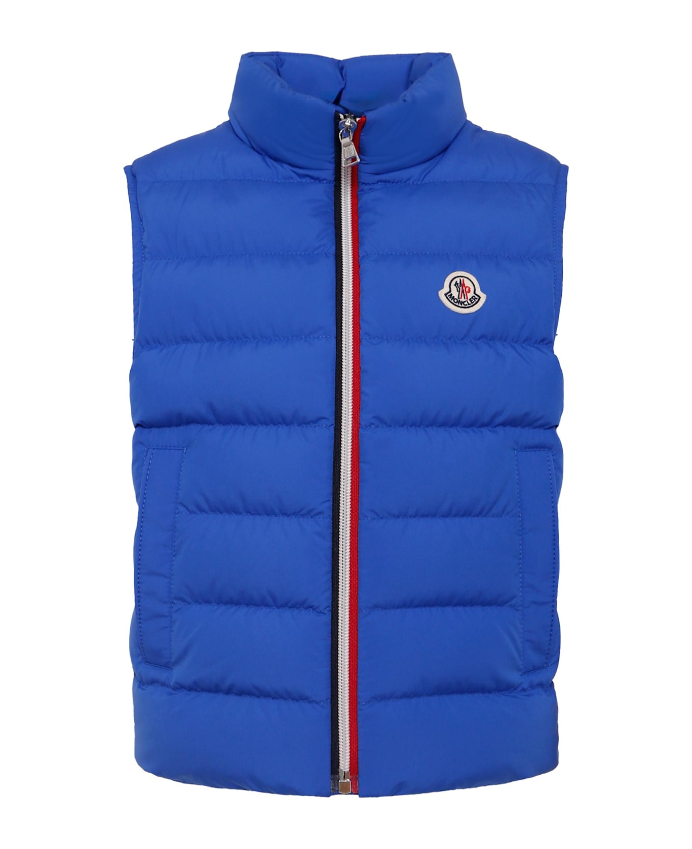 Lightly padded and quilted blue vest, with high collar, front zip fastening, side pockets with snap button and blue and red detail on the front; made of recycled polyether. It is embellished with an iconic logo patch applied on the chest.