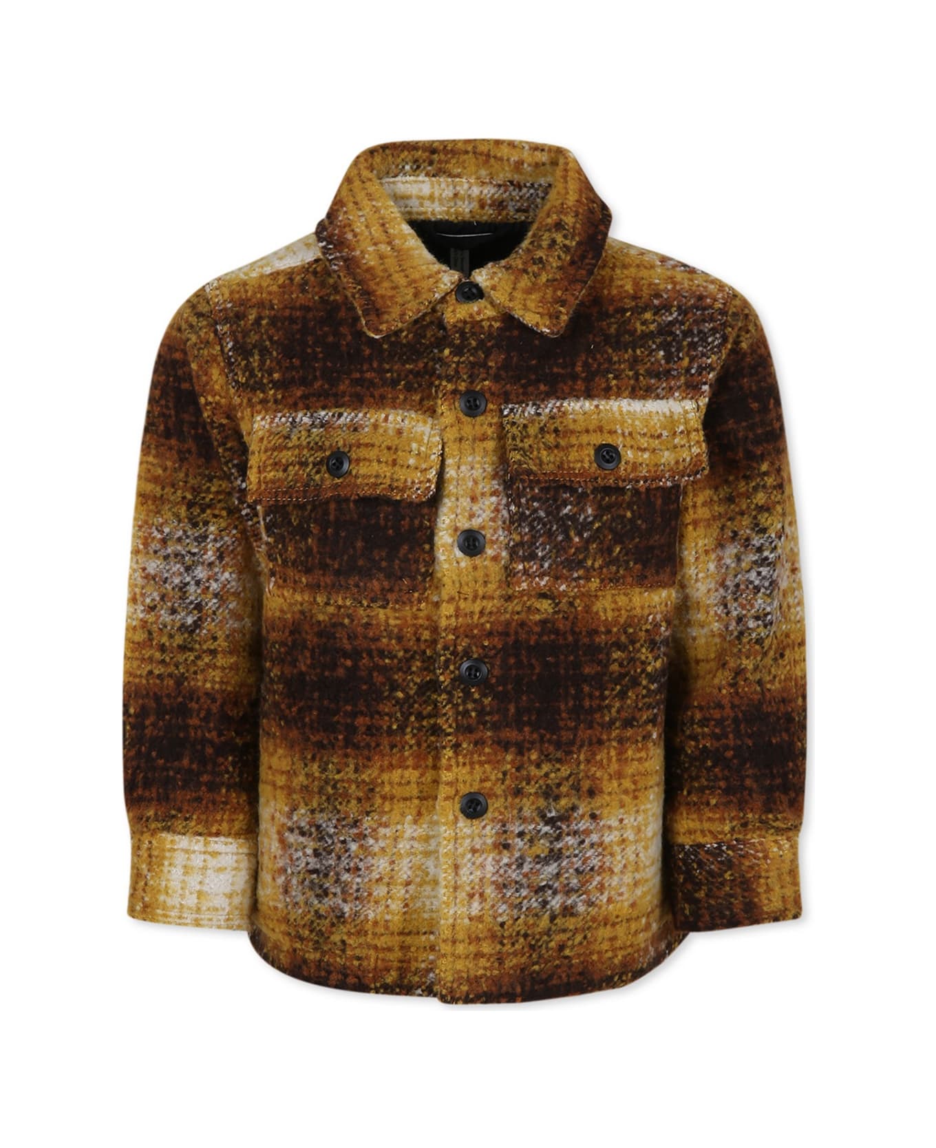 Brown checked jacket, with long sleeves, pointed collar, front button fastening, side pockets and flap and button pockets on the chest.