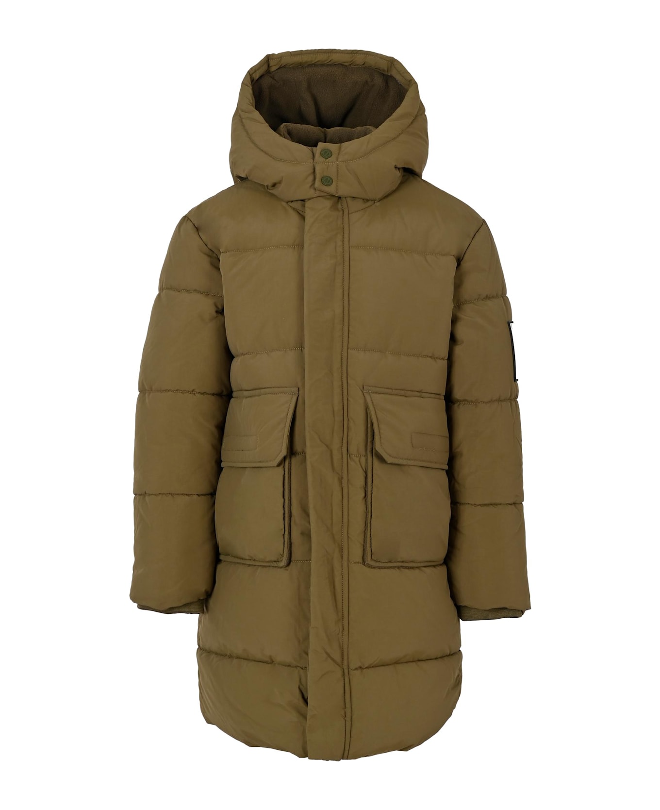 Long, heavy green down jacket, padded and quilted, with long sleeves, a fleece-lined hood, a front zip and snap button closure, front flap pockets, and ribbed cuffs; made from recycled polyamide. It is embellished with a logo on the back and a rubberized logo patch on the sleeve.