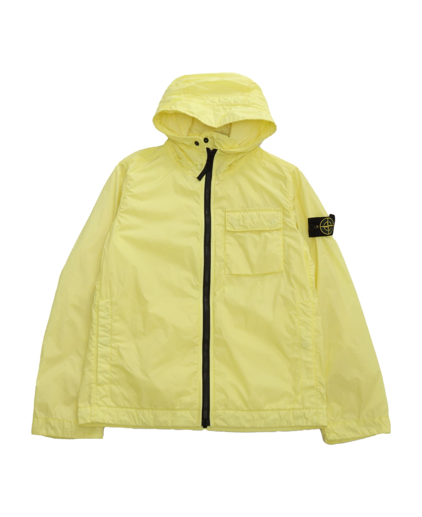 Technical fabric jacket, fixed hood, chin guard, zip closure, flap pocket on the chest, removable logo detail on the sleeve, adjustable cuffs