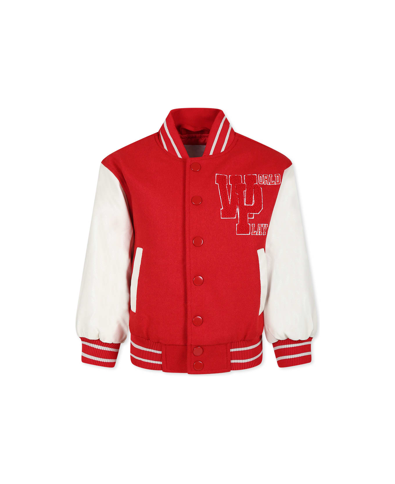 Red padded bomber jacket, with long sleeves in contrasting faux leather, low collar, front closure with snap buttons, side pockets, ribbed cuffs and hem. It is embellished with terrycloth college-style writing on the chest.