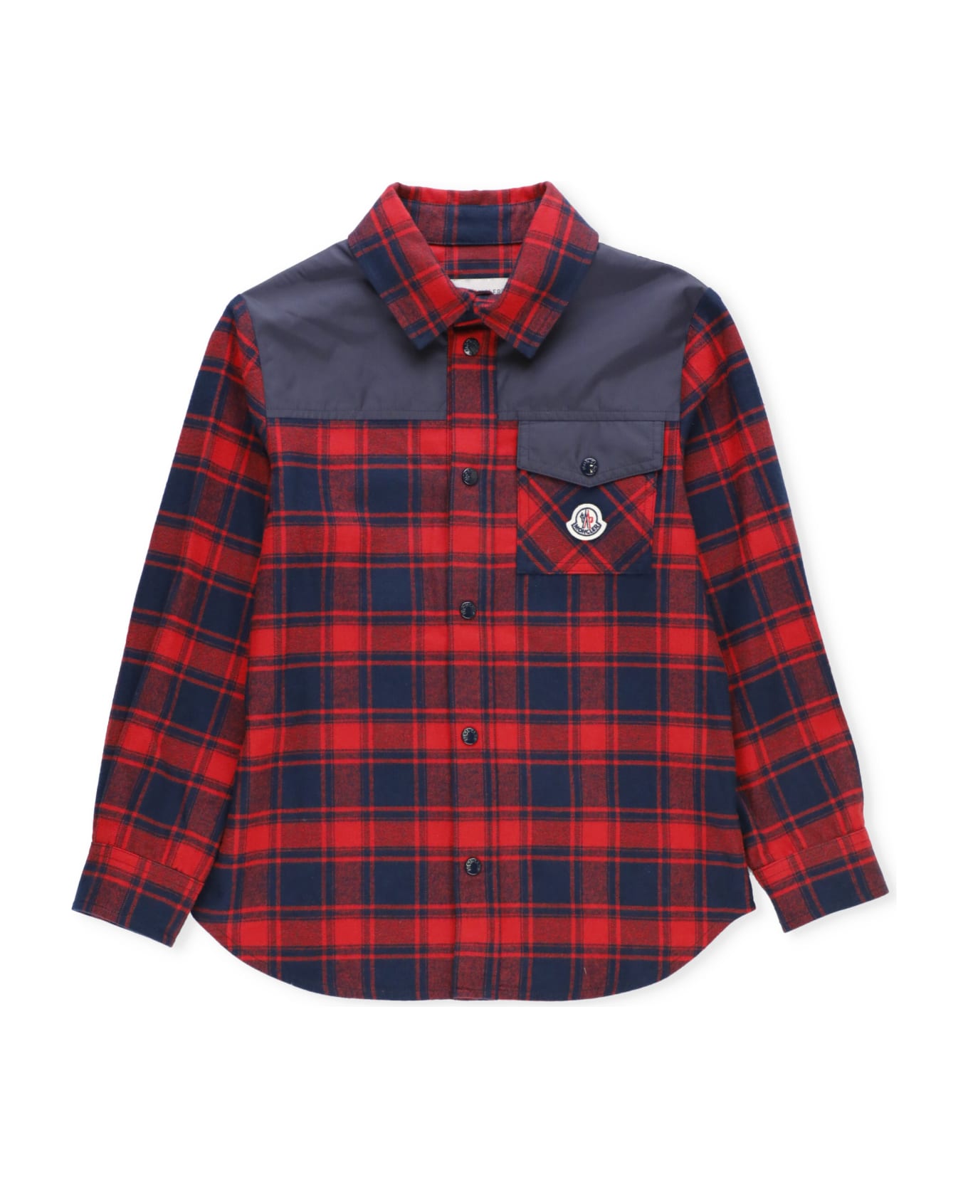 - Red Moncler Enfant cotton shirt for boy - Collar - Long sleeves with snap buttons - Front snap buttons fastening - One chest pocket - Front contrasting color logoed patch - Contrasting fabric upper part - Contrasting color - All-over contrasting color check pattern