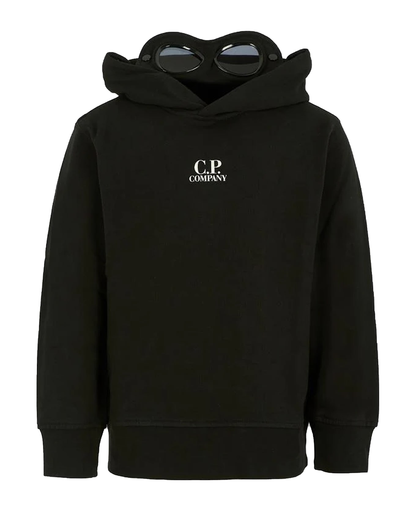 Black sweatshirt in fleece cotton, with long sleeves, a hood with a lens patch on the front, and ribbed cuffs and hem. It is embellished with logo print on the front.