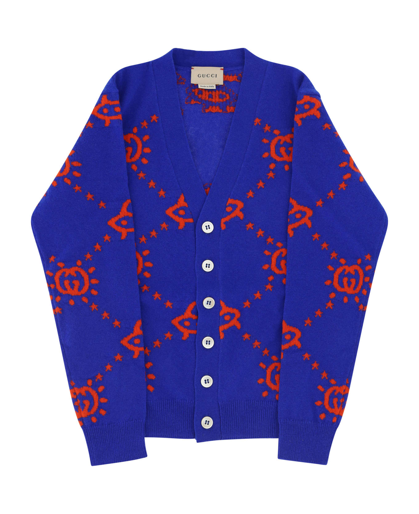 Wool cardigan for boy by gucci, button front closure, ribbed cuffs, ribbed front v-neck, ribbed hem, iconic all-over contrasting brand gg supreme graphic, regular fit. Composition: 100% % Wool