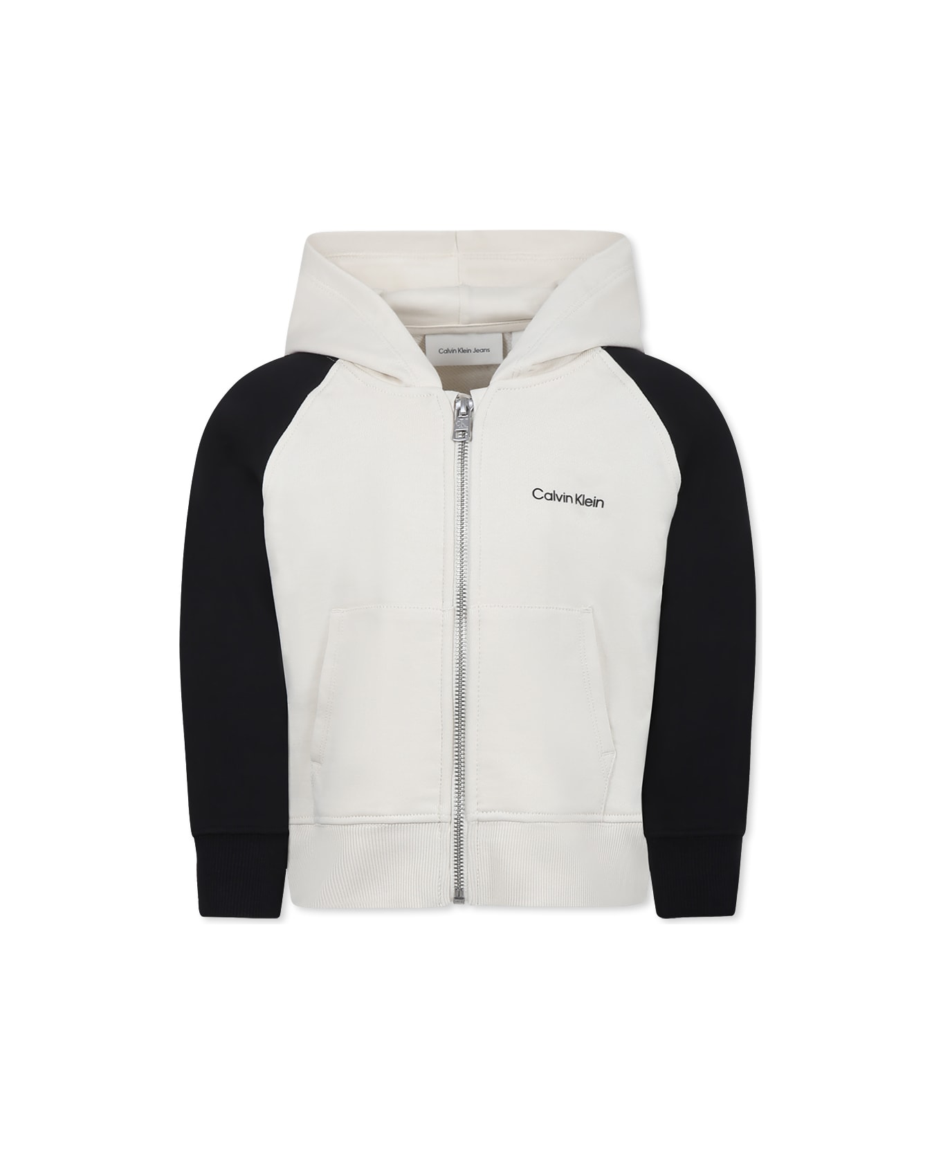 Ivory brushed cotton sweatshirt with contrasting black long sleeves, hood, front pockets, ribbed cuffs and hem; made with 95% regenerated cotton. It is embellished with rubberized logo on the chest.