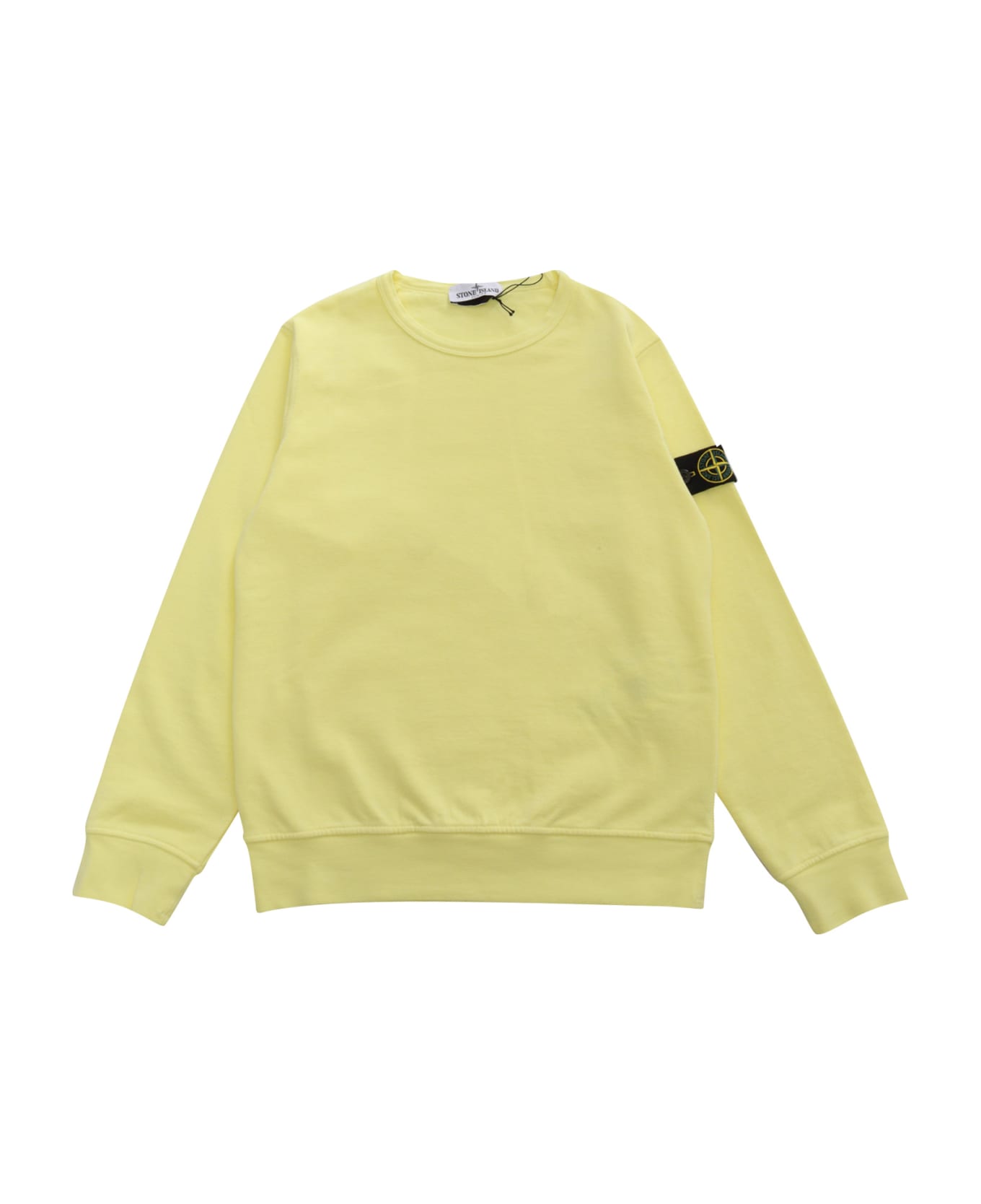 Crewneck cotton sweatshirt, ribbed edges, removable logo detail on the sleeve