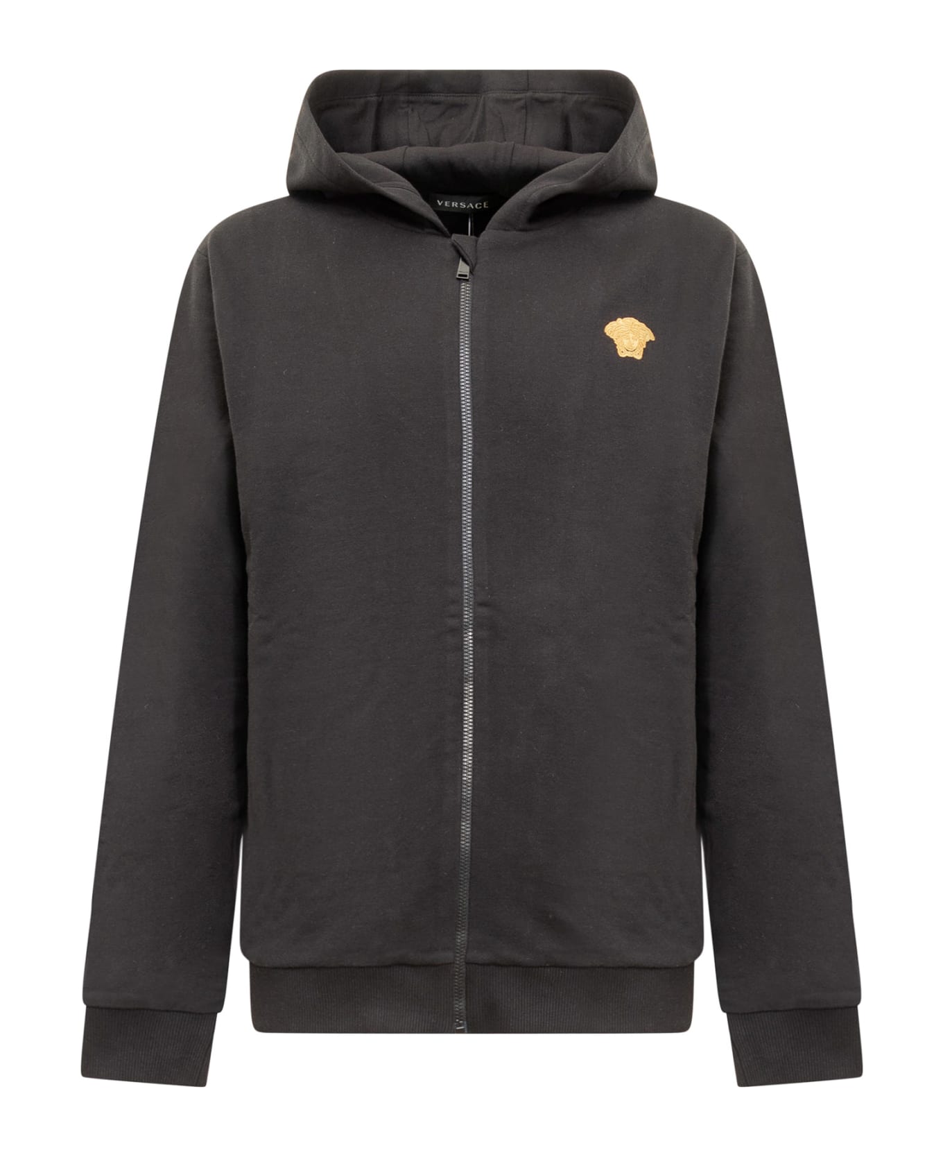 Hooded sweatshirt. Zip closure. Ribbed cuffs and bottom. Medusa patch on chest.
