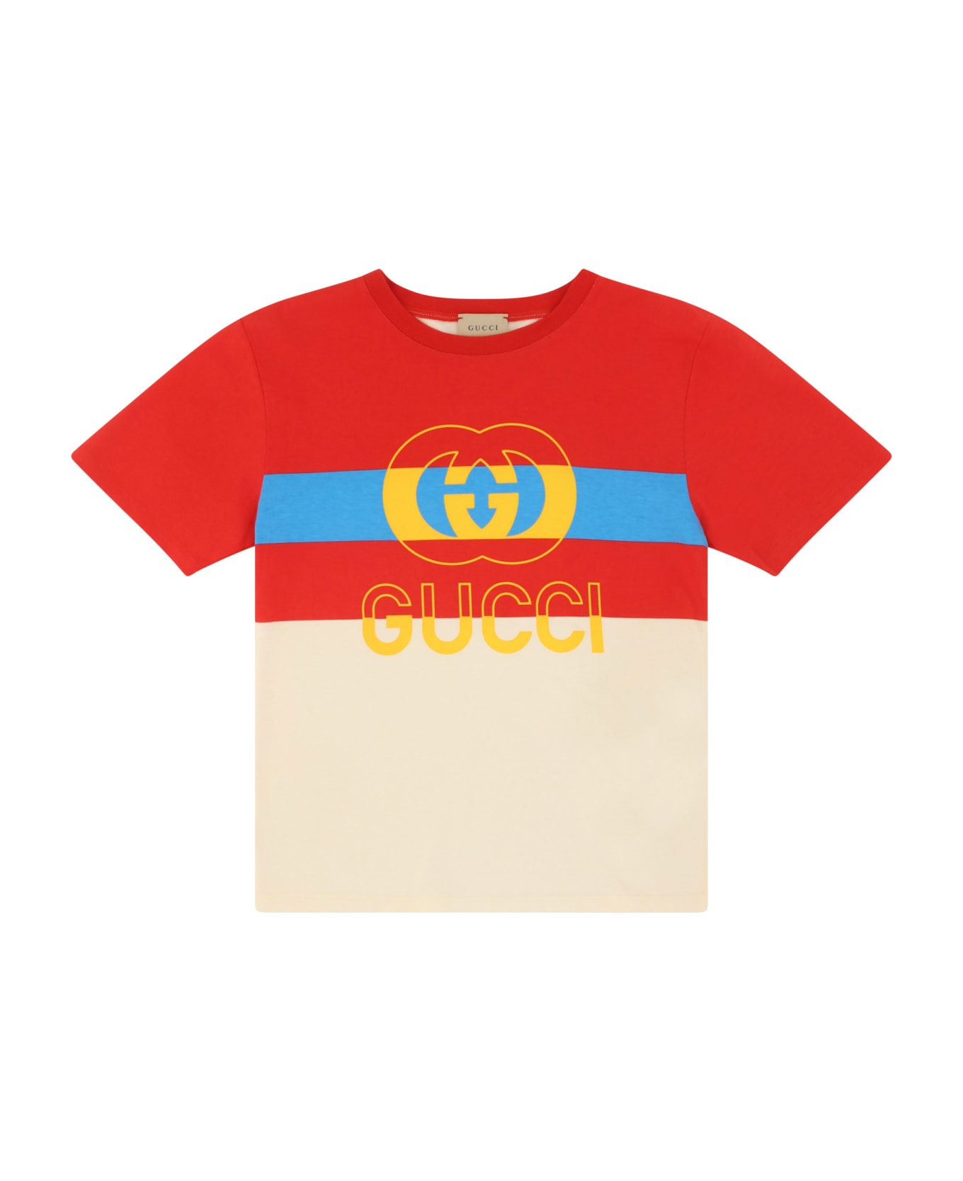 Cotton t-shirt for boy by gucci, ribbed crew neck, print on the front with iconic multicoloured brand signature. Composition: 100% % Cotton