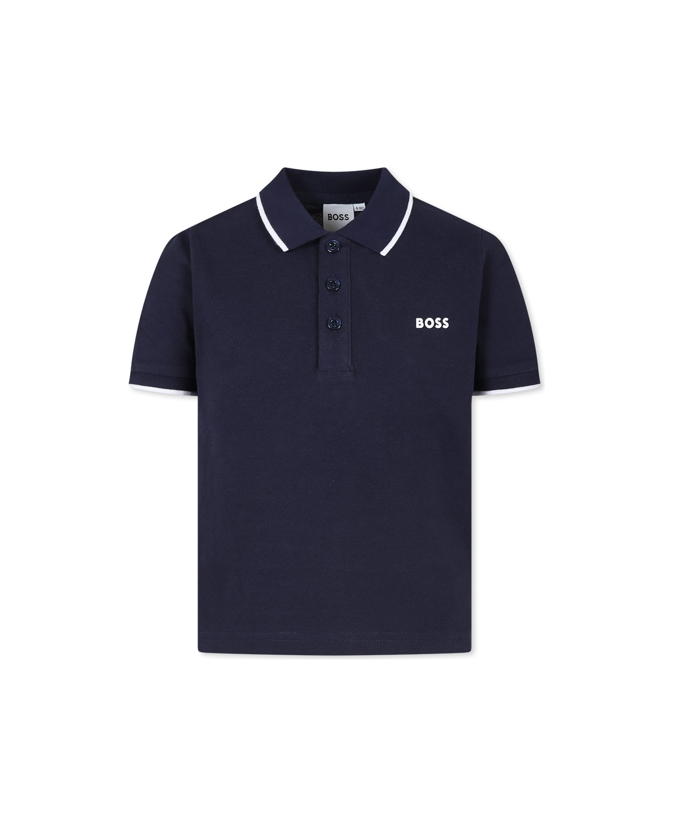 Blue polo shirt in cotton piqué, short sleeves, with ribbed collar and front button closure. It is embellished with rubberized logo on the chest.