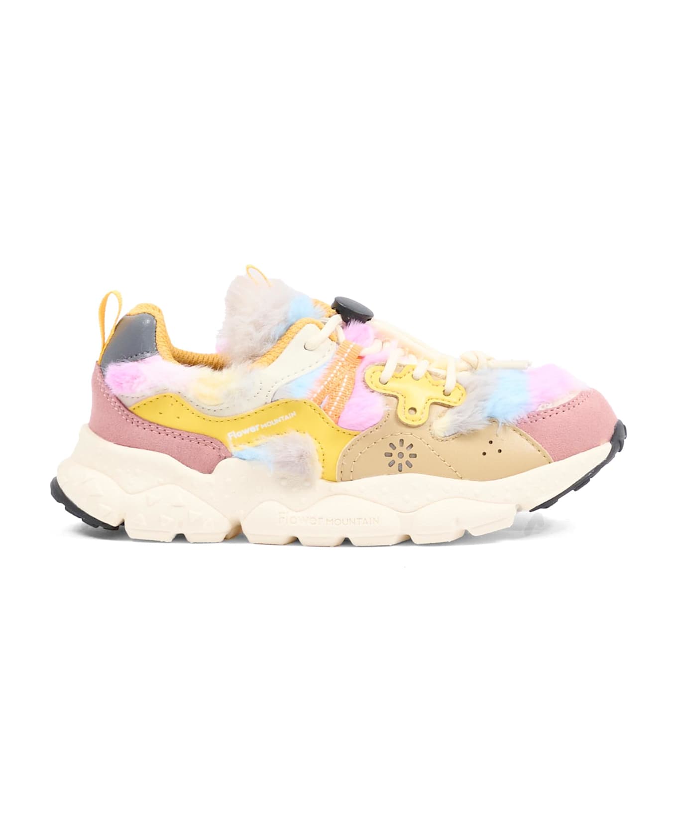 Multicolored vegan sneakers made of faux fur and faux leather, with a rubber sole, drawstring laces, and a round toe. They are embellished with a side logo. This item is a Flower Mountain x Naturino collaboration.