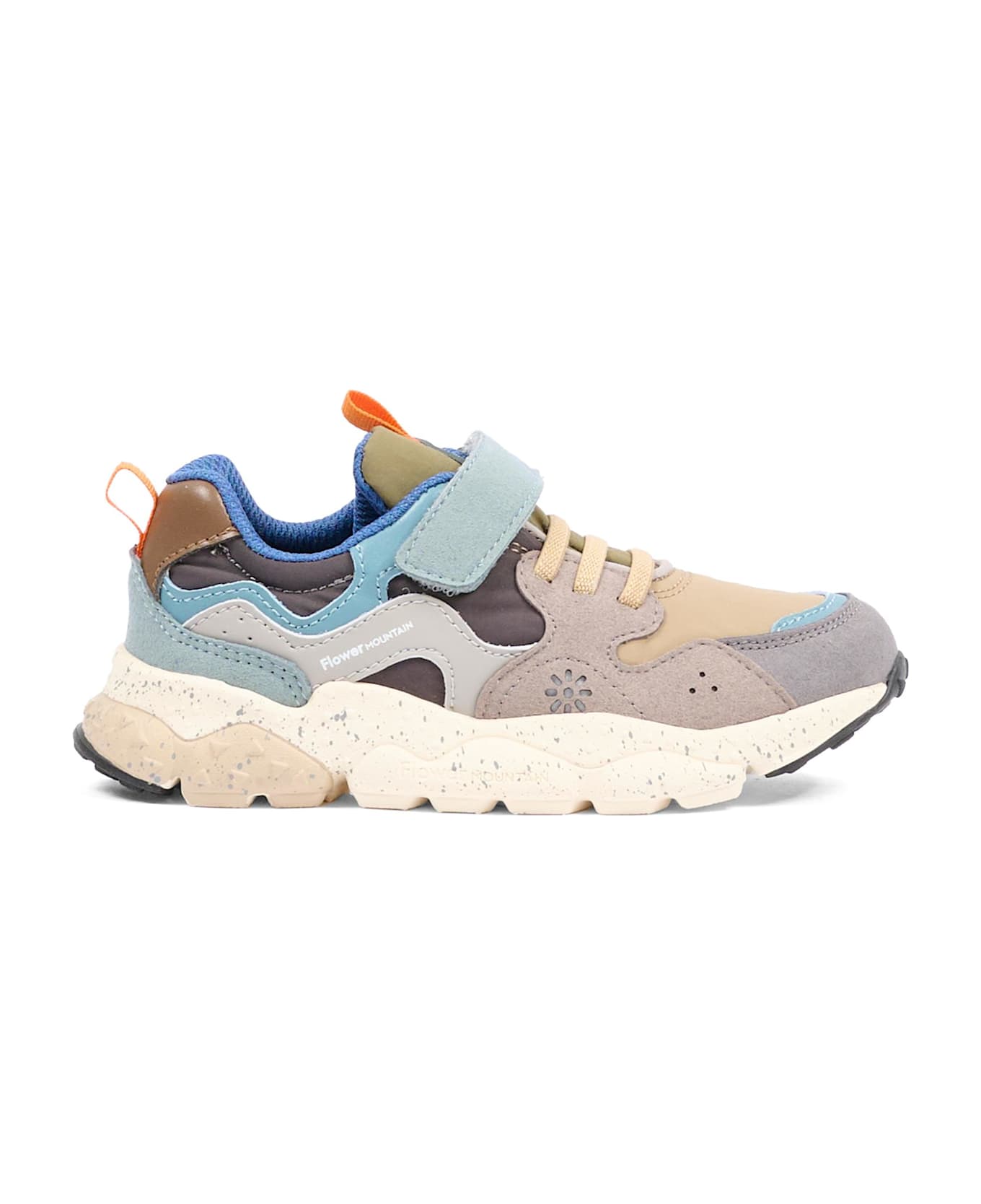 Multicolored vegan sneakers made of faux leather with a rubber sole, velcro closure, elastic laces, a round toe, gray and blue detailing, and an orange tab on the heel and front. They are embellished with a side logo. This item is a Flower Mountain x Naturino collaboration.