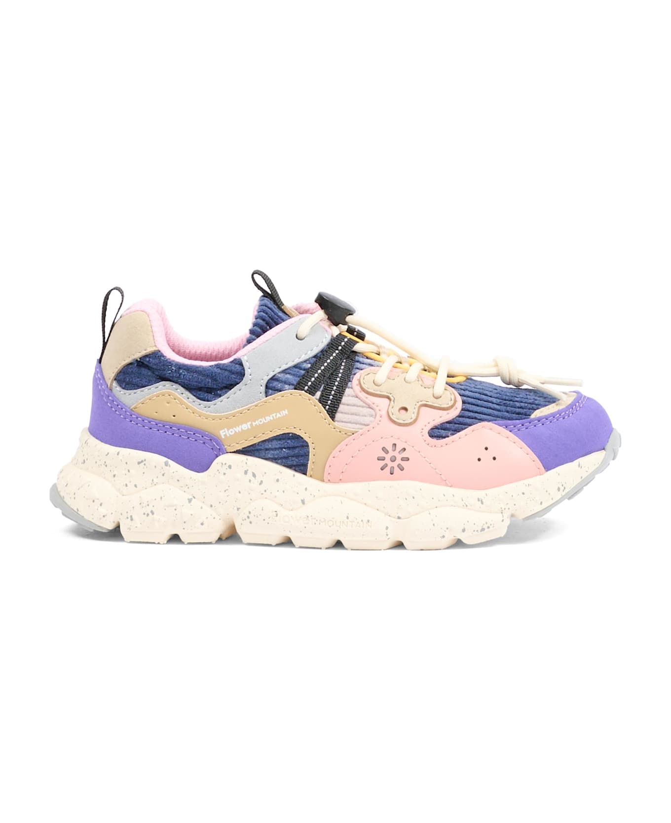Multicolored vegan sneakers made of faux leather with a rubber sole, drawstring laces, a round toe, and blue corduroy detailing. They are embellished with a side logo and purple and pink details. This item is a Flower Mountain x Naturino collaboration.