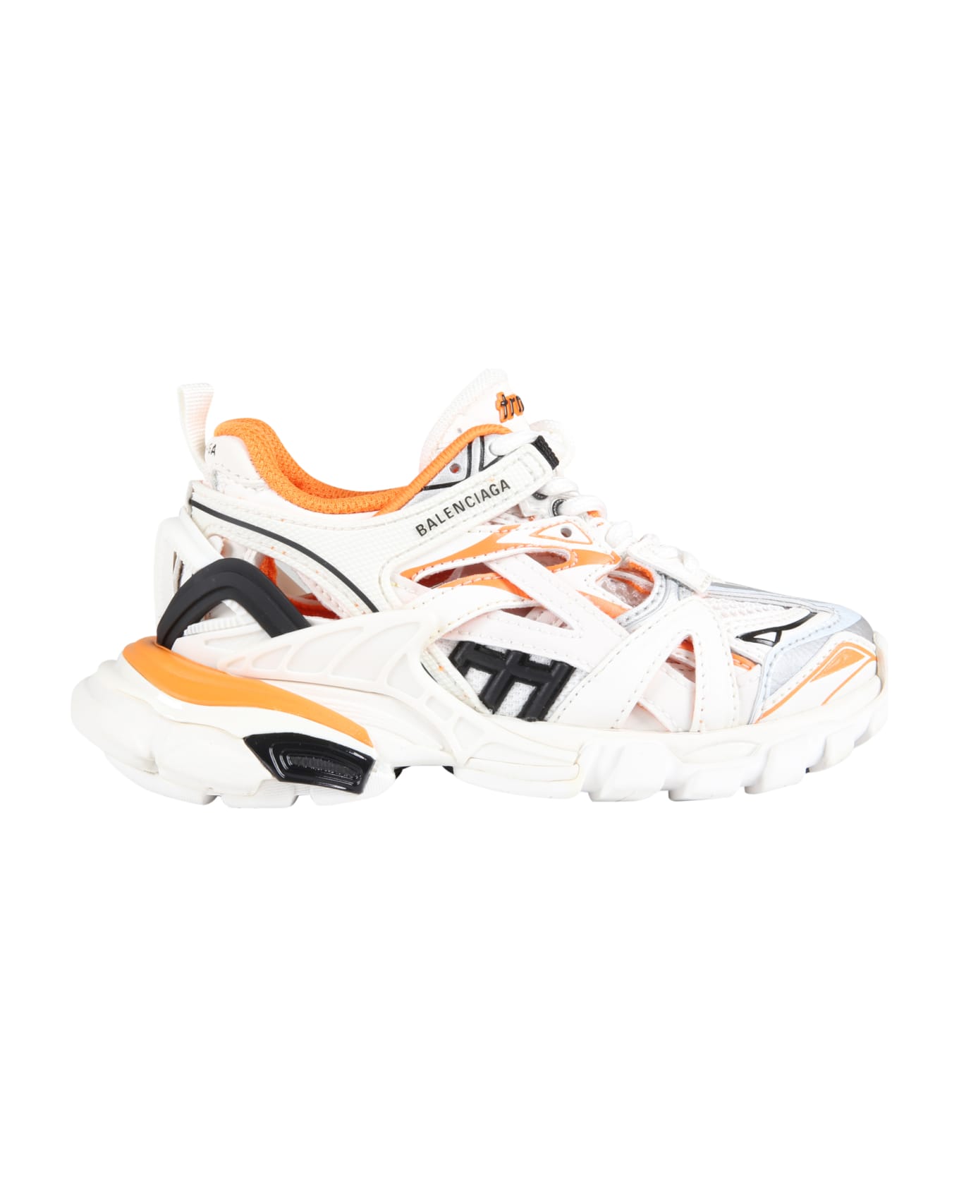 White sneakers with rubber sole with increased rear part to stimulate the forward movement of the foot and closure with laces on the front. They are embellished with orange details, rubber logo on the front, embossed BB logo on the front sole, metallic mesh on the sides and rubber logo on the side.