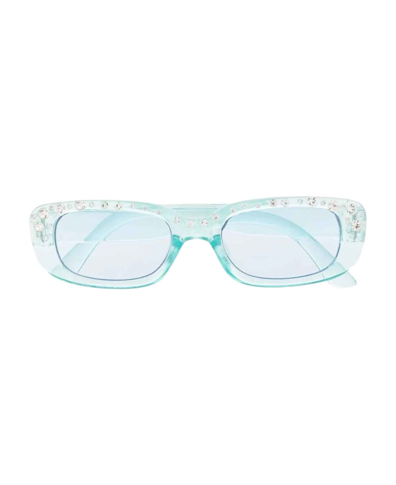 Blue glasses girl. Decorated with synthetic diamonds, rectangular frame, light blue lenses, lenses with UV protection, straight temples and temples with curved tips. 100% polycarbonate