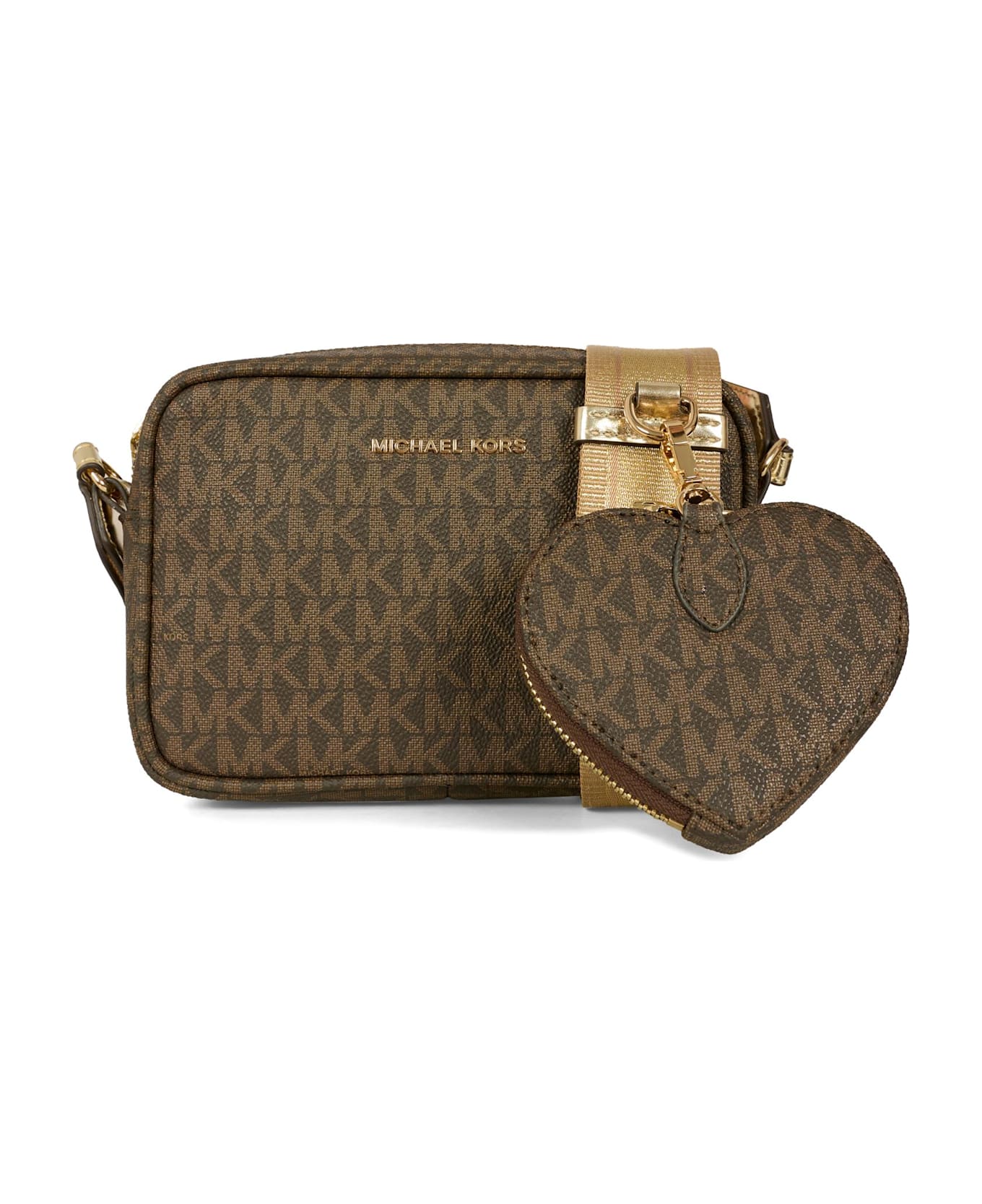 Brown faux leather bag with adjustable shoulder strap, zip closure, and heart-shaped zip coin pocket. It is embellished with an all-over contrasting logo and logo on the front.