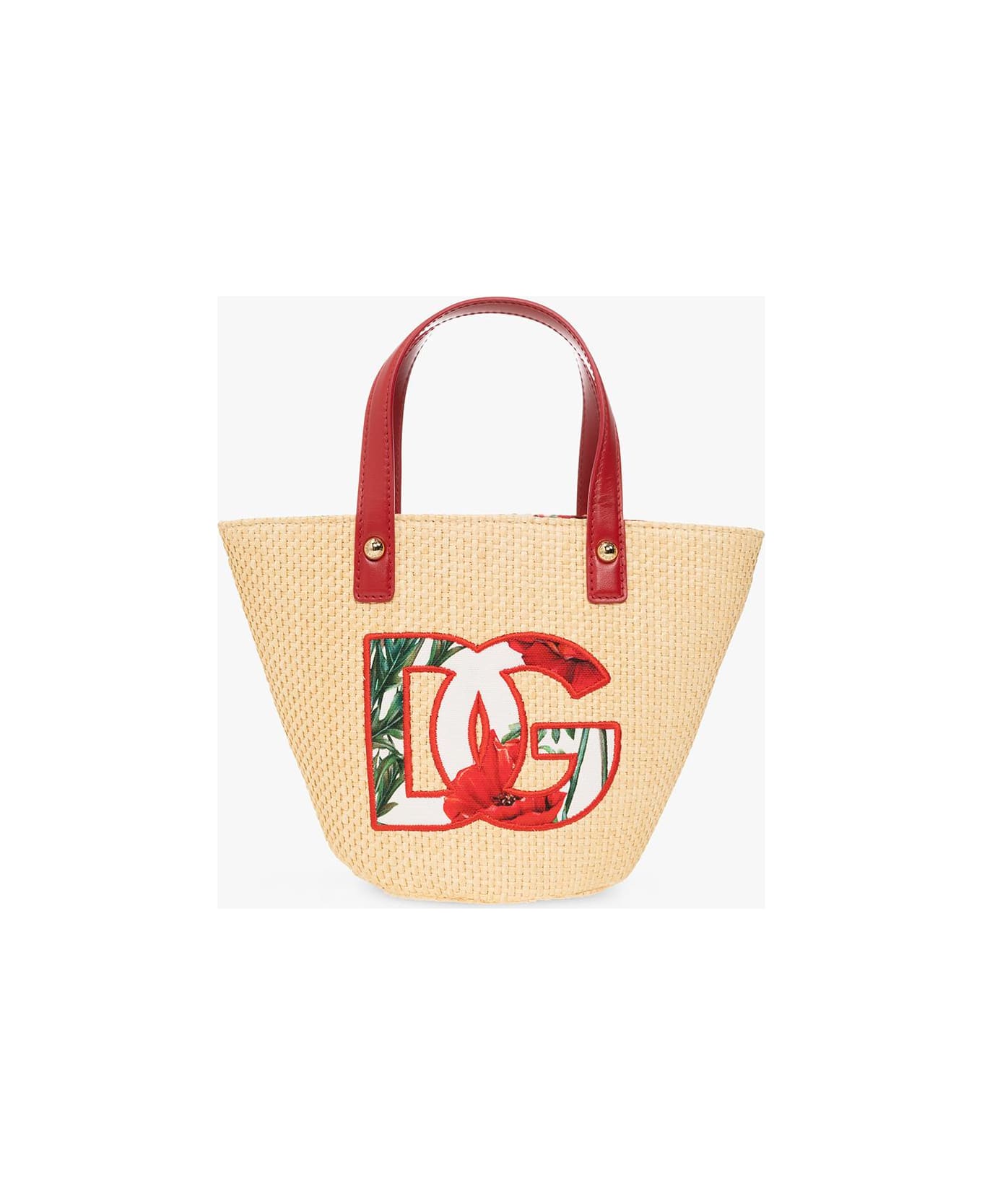 Light beige woven shopper bag from Dolce & Gabbana Kids. Embellished with a floral insert, this design secures with a magnetic snap and features two half-round handles in calf leather, gold-tone metal hardware and a white cotton-clad interior with a colou Composition: 47% Viscose 37% Calf Leather 16% Cotton