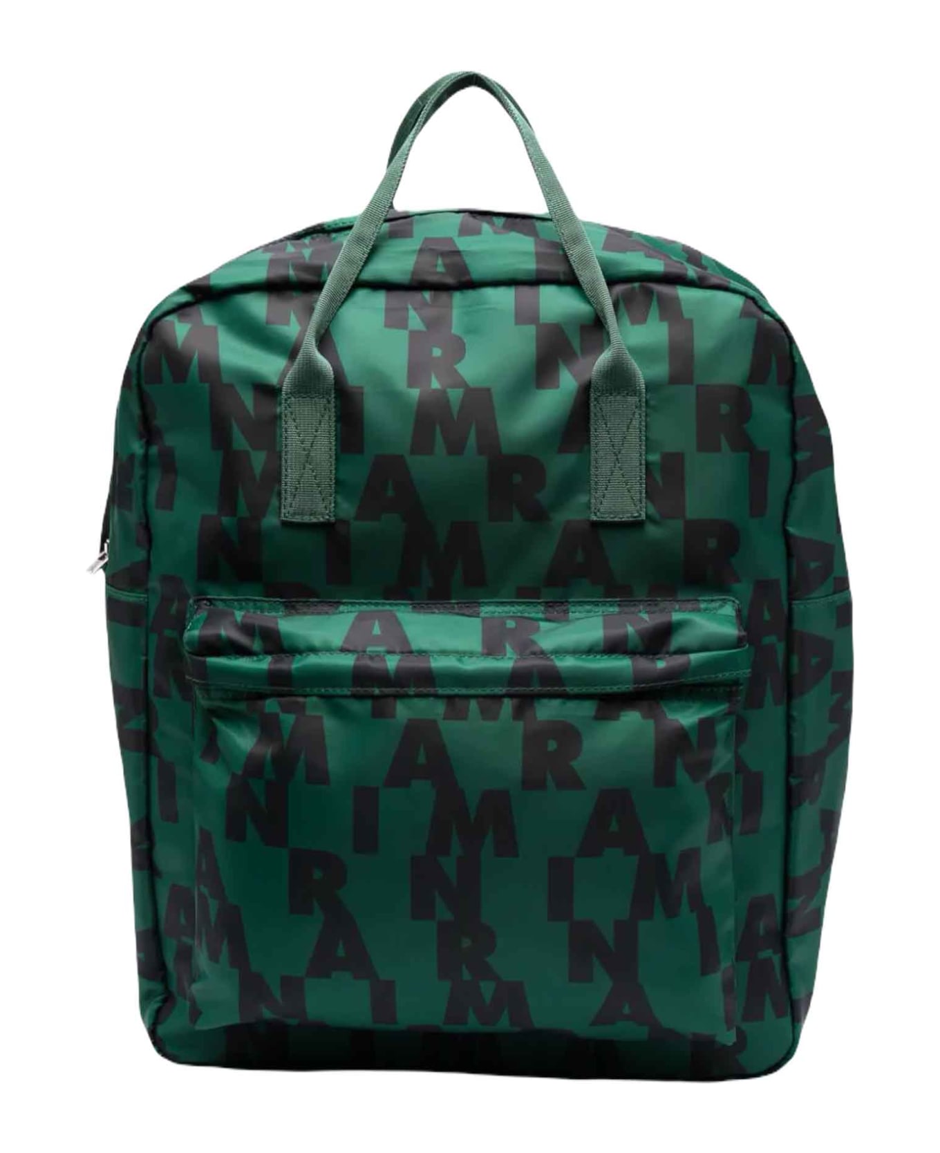 green backpack unisex. All-over logo print, top zip closure, two adjustable padded shoulder straps, two flat handles and front zip pocket. Nylon 100%, Polyester 100%