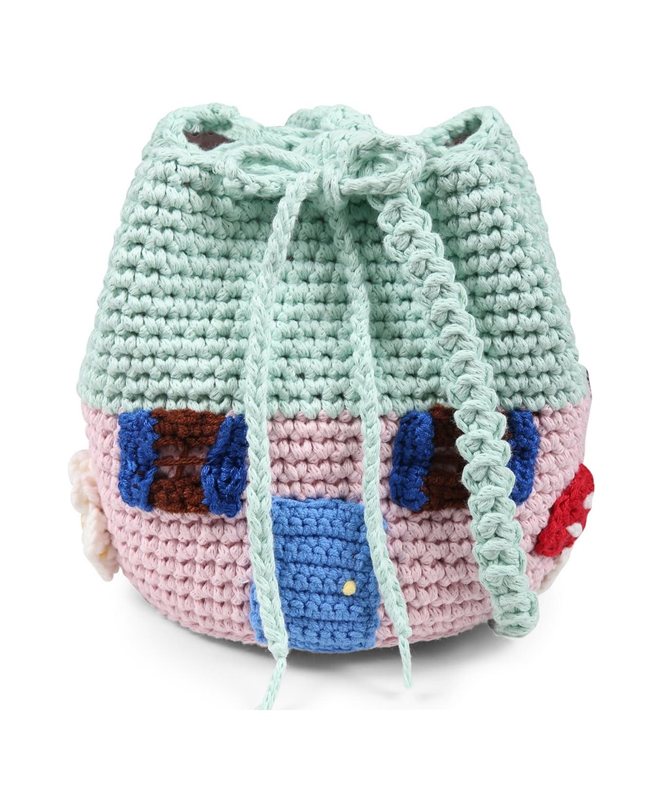 Multicolor crochet bag, with shoulder strap and drawstring closure; made of soft organic cotton. It is embellished with an embroidered house, mushrooms and flowers. Height 15 cm; Diameter 14 cm.