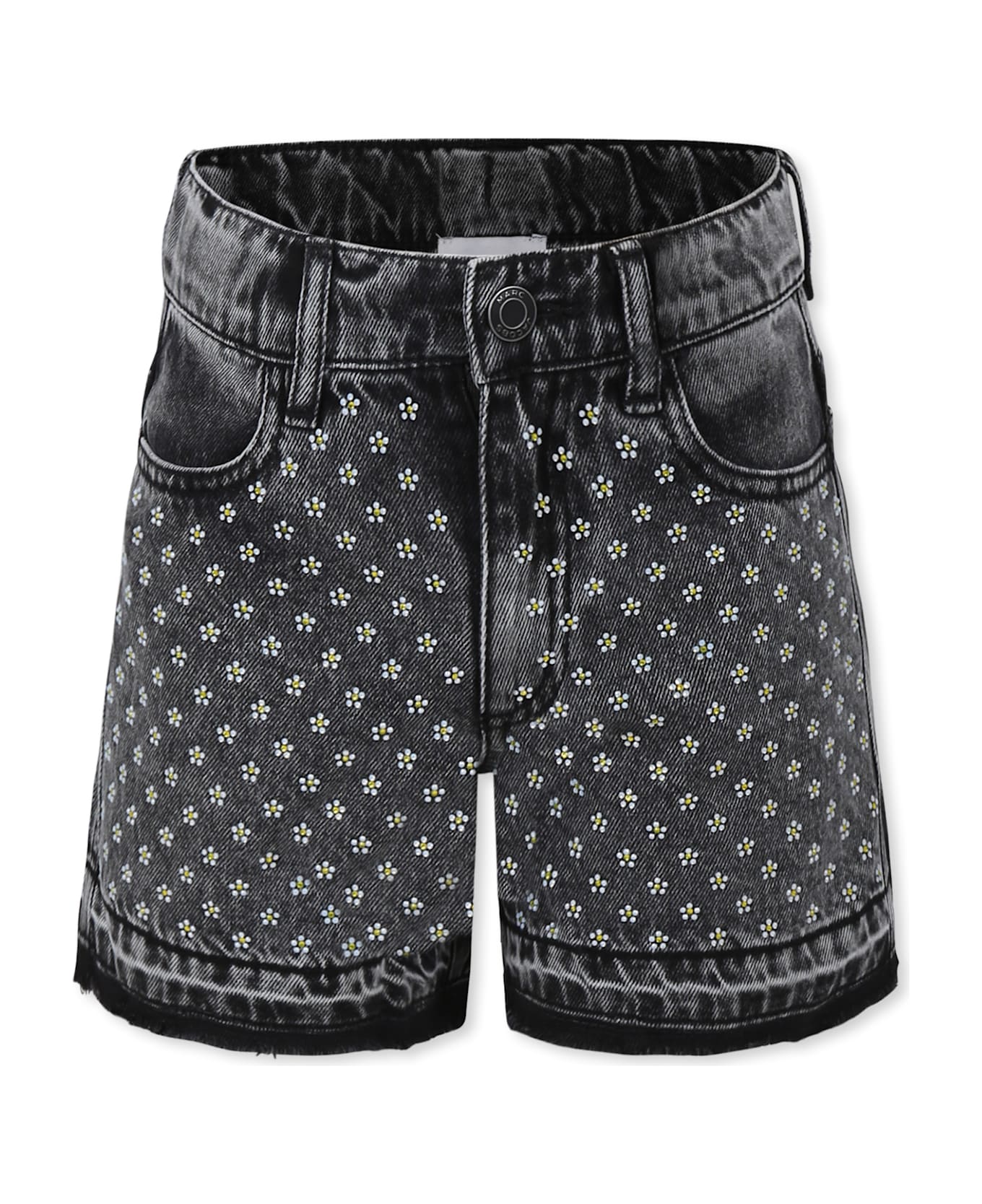Black cotton shorts with belt loops, zip and snap button front fastening, adjustable waist with internal elastic with buttons, side pockets, back pockets and frayed edges. They are embellished with rhinestone flowers on the front and a rubber logo patch on the back.