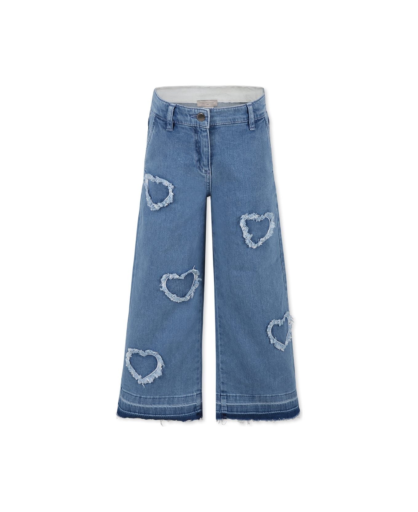 Flared blue denim jeans with belt loops, zip and hook front fastening, adjustable waist with internal elastic with buttons, side pockets, back pockets and frayed edges. They are embellished with fringed hearts on the front and back, with a logo patch on the back.