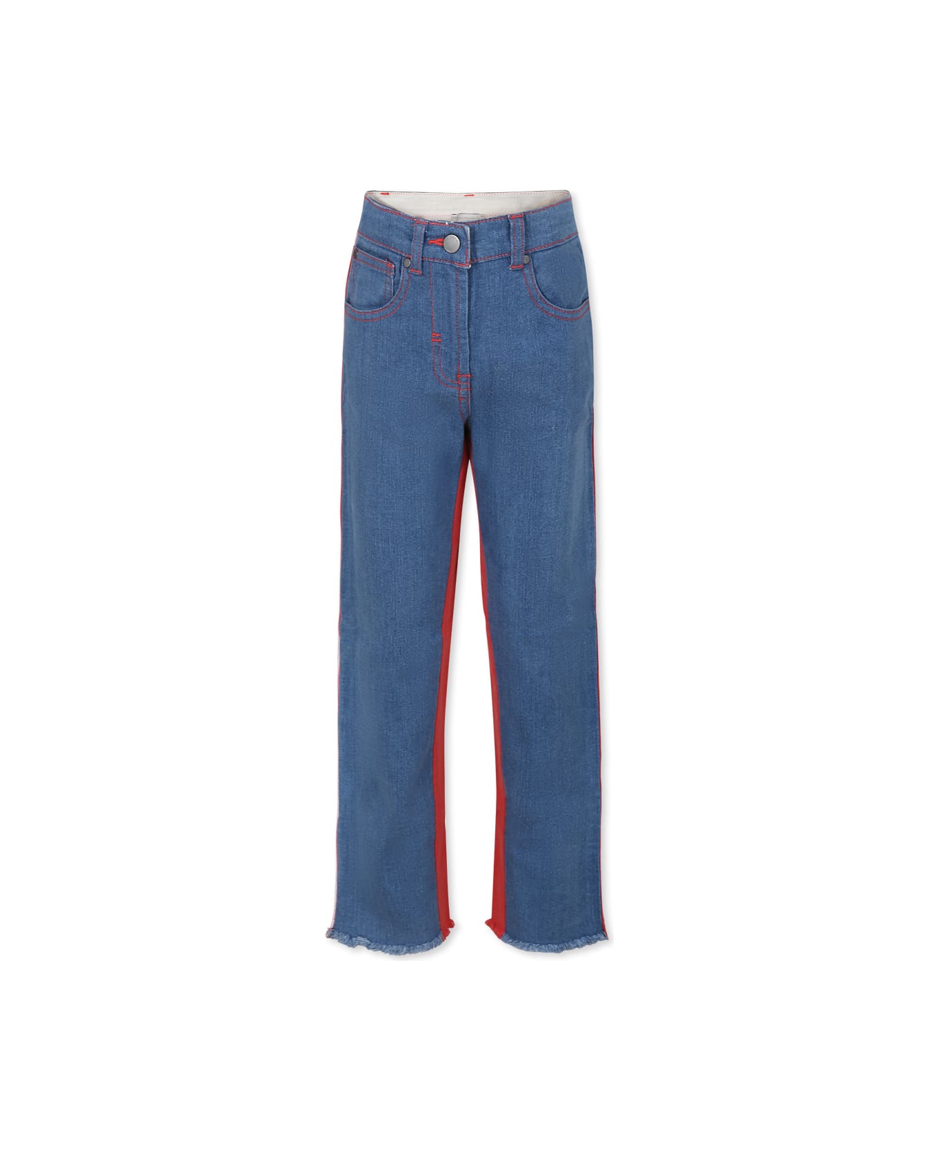 Blue denim jeans, five pockets, with belt loops, front zip and hook fastening, adjustable waist thanks to internal elastic with buttons, frayed edges. They are embellished with a logo patch on the back and logo side bands.