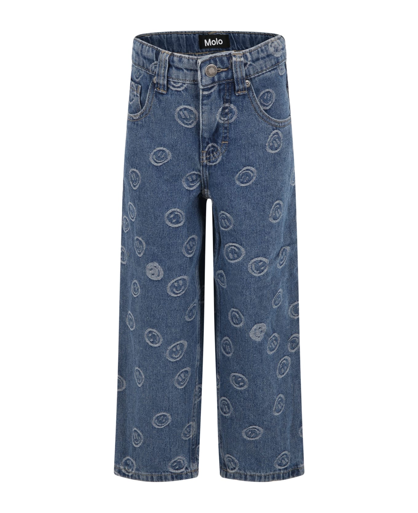 Five pocket blue denim jeans, with adjustable waist thanks to the internal elastic bands with button, belt loops and button and zip fastening on the front. They are embellished with all-over smiley face and logo patch on the back.