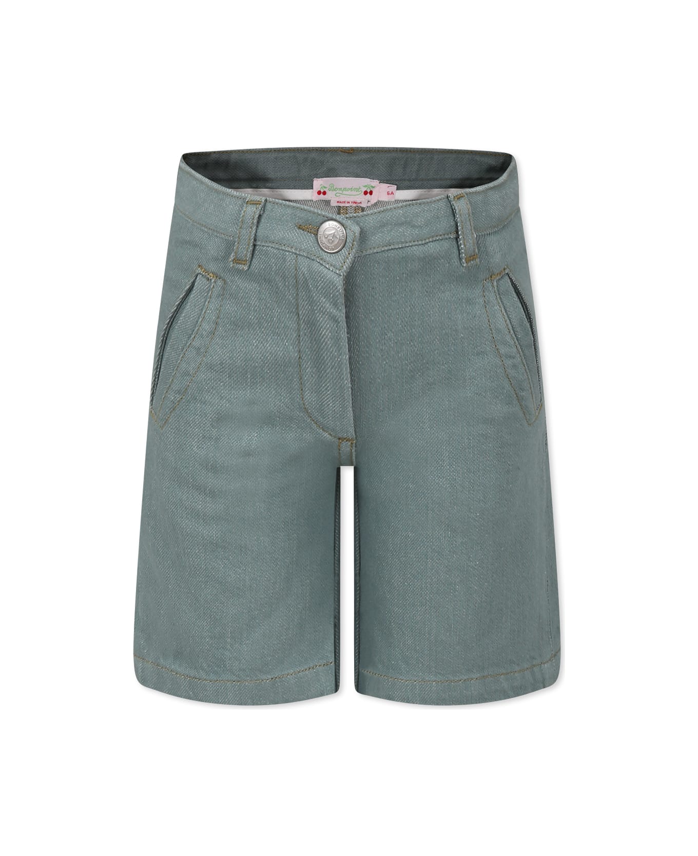 Green cotton shorts with belt loops, front zip and snap button fastening, adjustable waist with internal elastic with buttons, side pockets and patch pockets on the back. They are embellished with iconic embroidered cherries on the back.