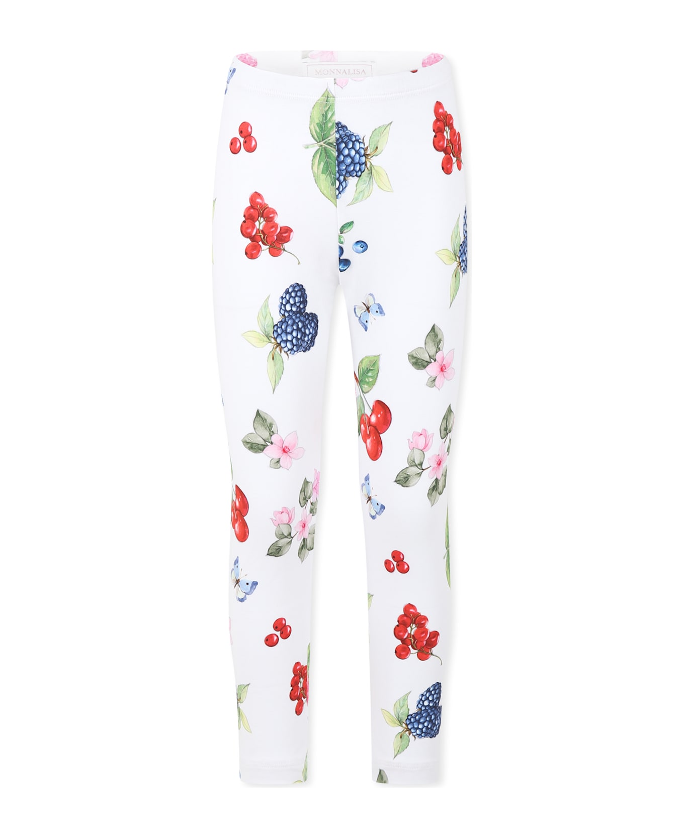 White leggings in cotton blend, with elasticated waist; embellished with an all-over fruit print.