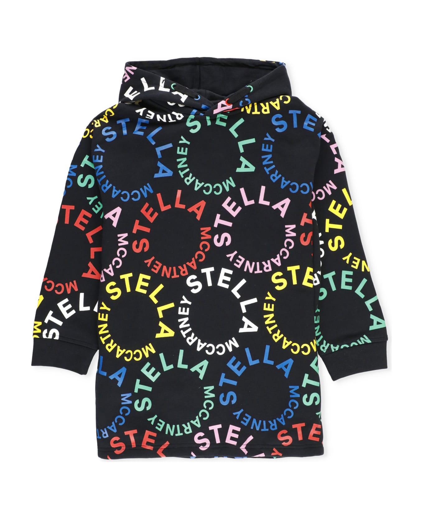 - Black Stella McCartney Junior cotton dress for girl - Hood with drawstrings - Long sleeves with elastic ribbed trims - All-over contrasting colour monogram logo