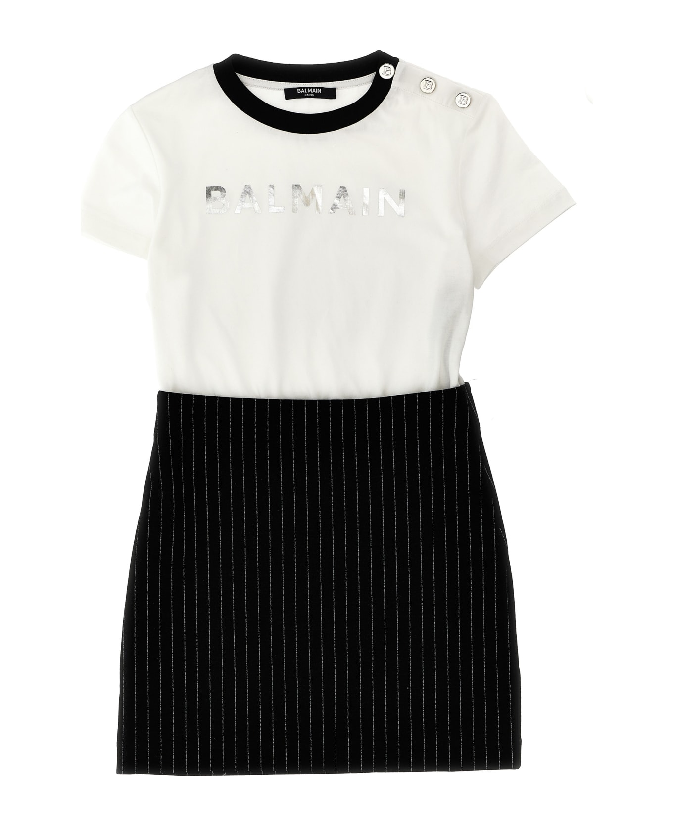 Cotton dress with front logo print, pinstripe skirt, crew neck, short sleeves. Composition: 61% vi 27% polyamide 6% elastane 6% pl