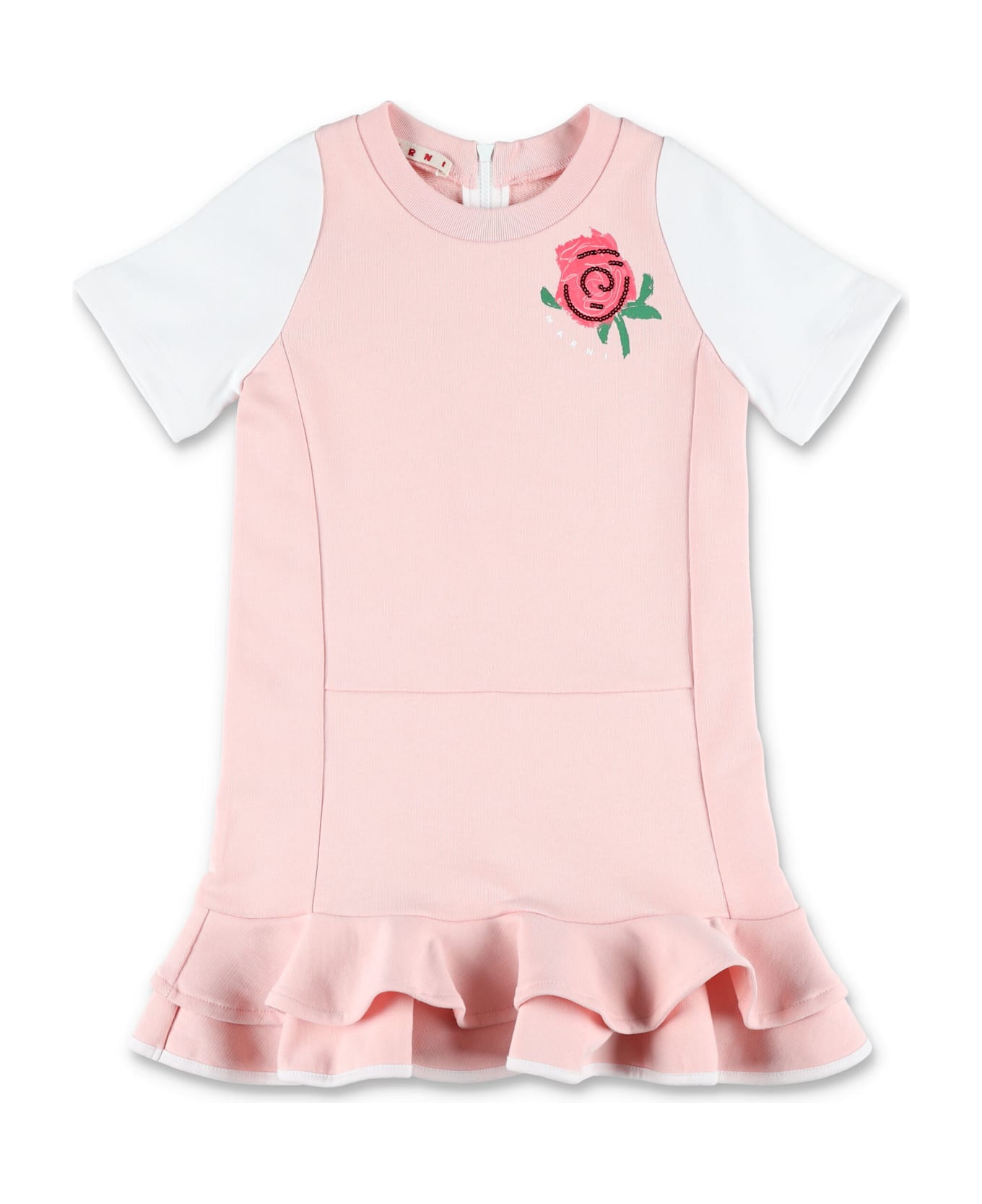 This Marni Dress Combines Playful Charm With Refined Design. Crafted From Soft Jersey, It Features A Clean Silhouette Enhanced By Contrast Short Sleeves And A Ruffled Hem For Added Movement. The Floral Print On The Chest Delivers A Signature Touch, Perfect For Both Everyday Wear And Special Moments. Soft Jersey Fabric