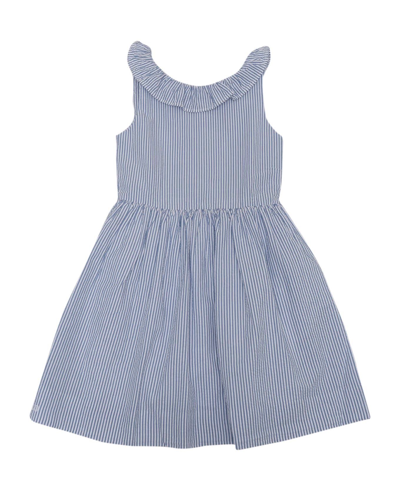 Cotton dress, blue and white striped design, sleeveless, ruffle, covered buttons on the back