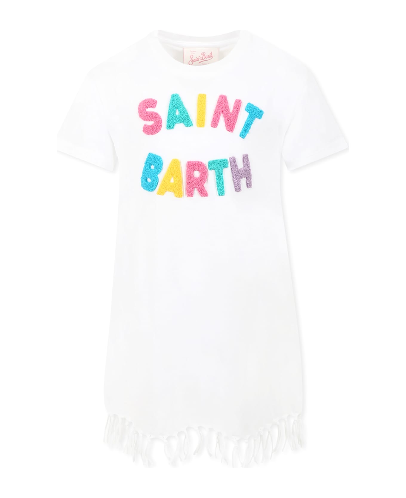 White cotton dress, with short sleeves, ribbed crew neck and fringed hem. It is embellished with multicolor sponge logo on the front.