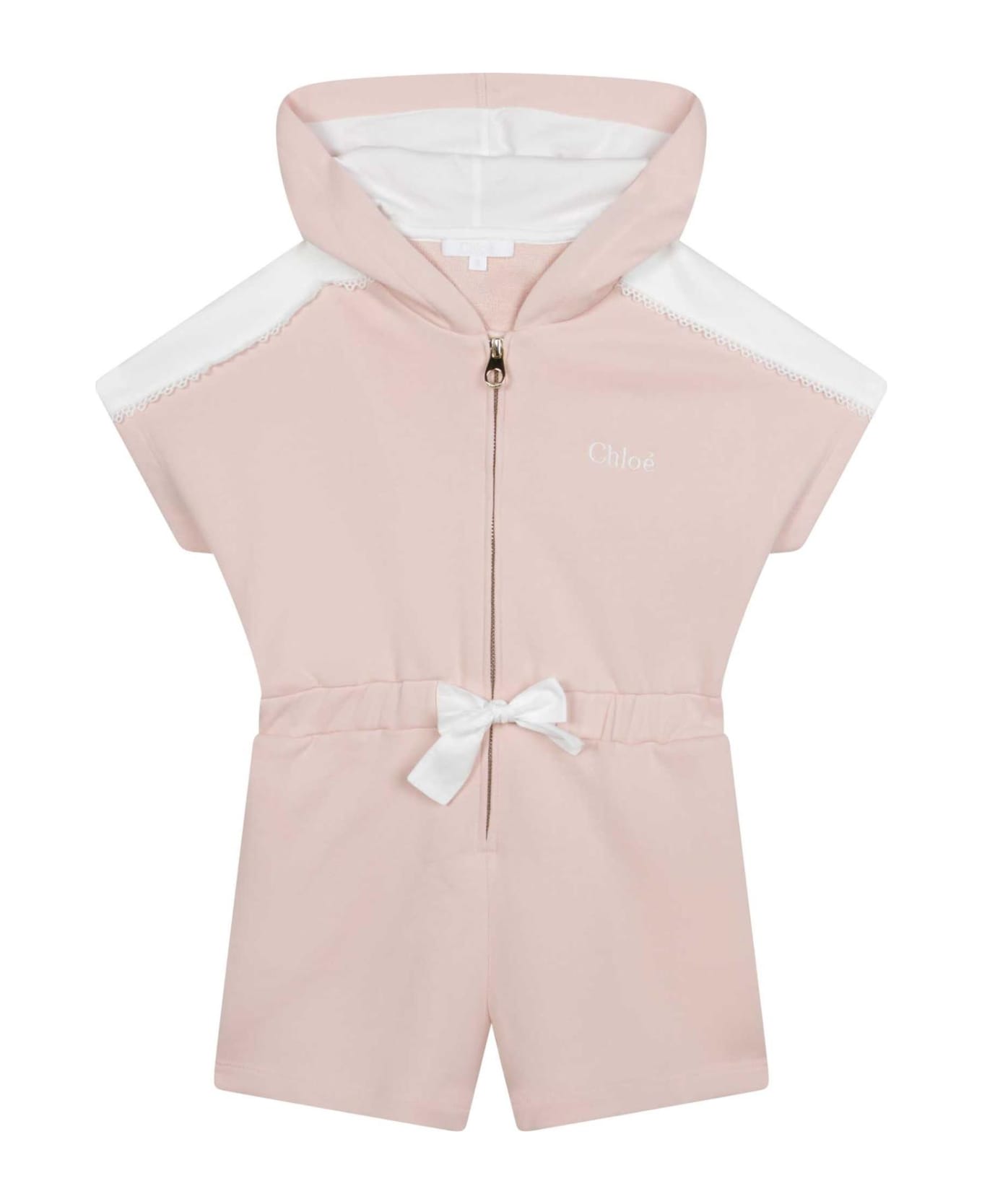 colour-block trim-detailing playsuit from CHLOÉ KIDS featuring light pink, white, cotton, colour-block design, gold-tone hardware, crochet trim, embroidered logo, classic hood, front zip fastening, drawstring fastening waist, short sleeves and above-knee length. Composition: Cotone, 100%