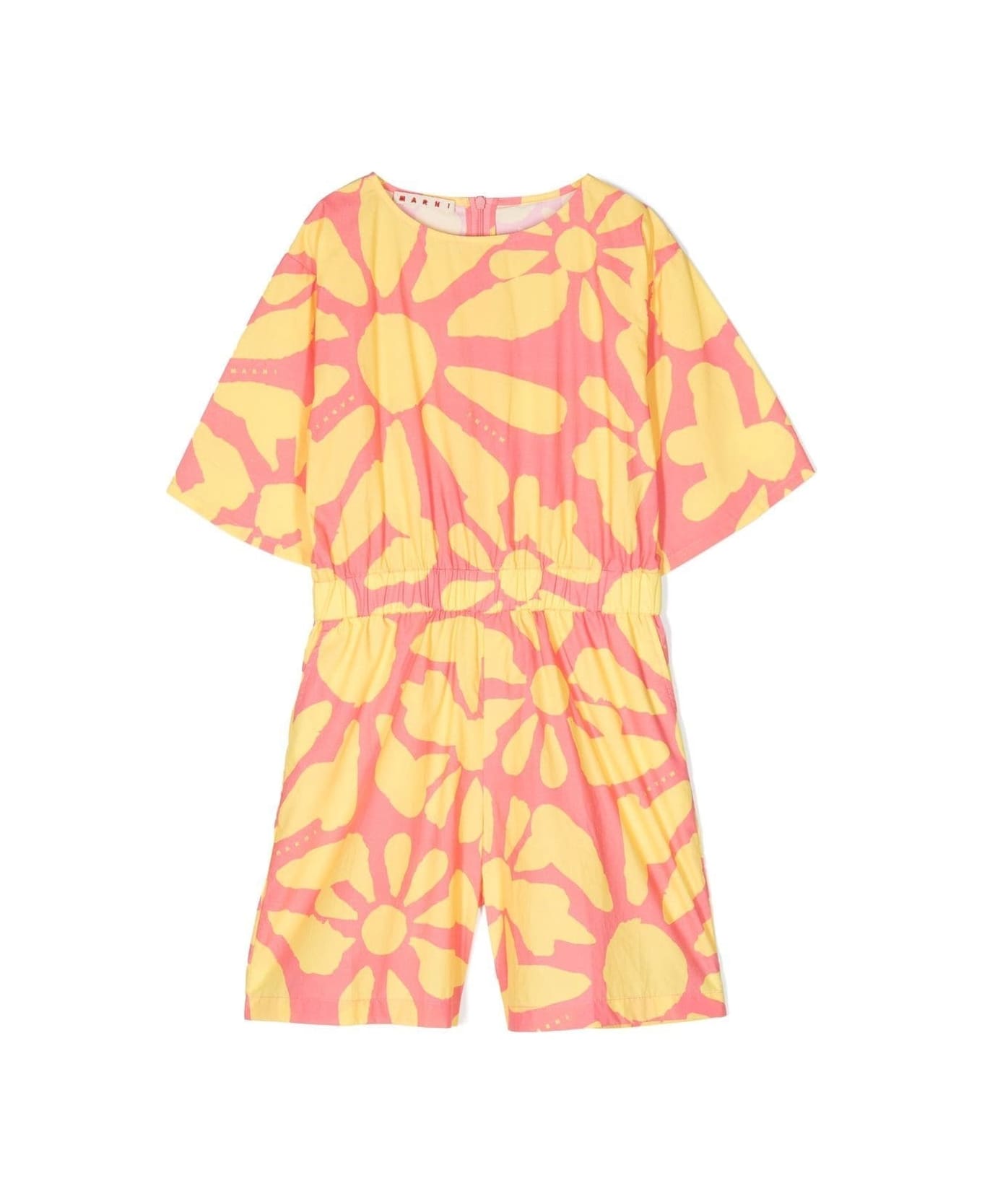 floral-print cotton playsuit from MARNI KIDS featuring multicolour, cotton, all-over floral print, logo waistband, round neck, short sleeves and thigh-length. Composition: Cotone, 100%