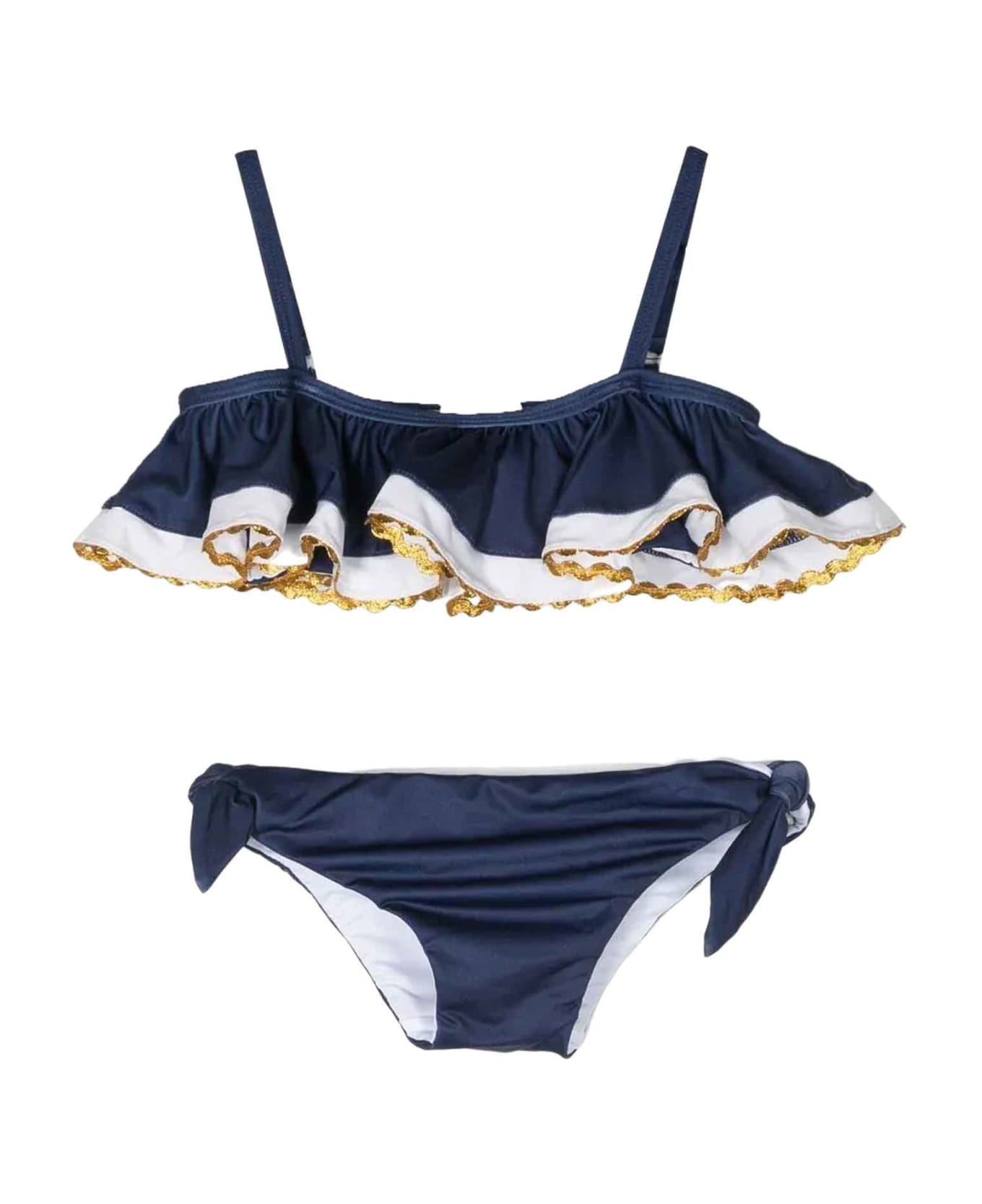 blue bikini girl. Finished with ruffles, spaghetti straps, elasticated design, logo print on the back and side knot fastening. Polyester 86%, Polyvinyl Acetate 14%