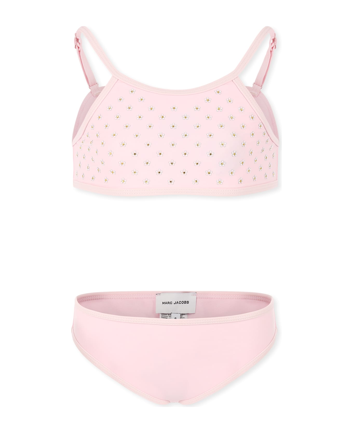 Pink bikini composed of top and briefs; top with adjustable straps, embellished with rhinestone flowers on the front.