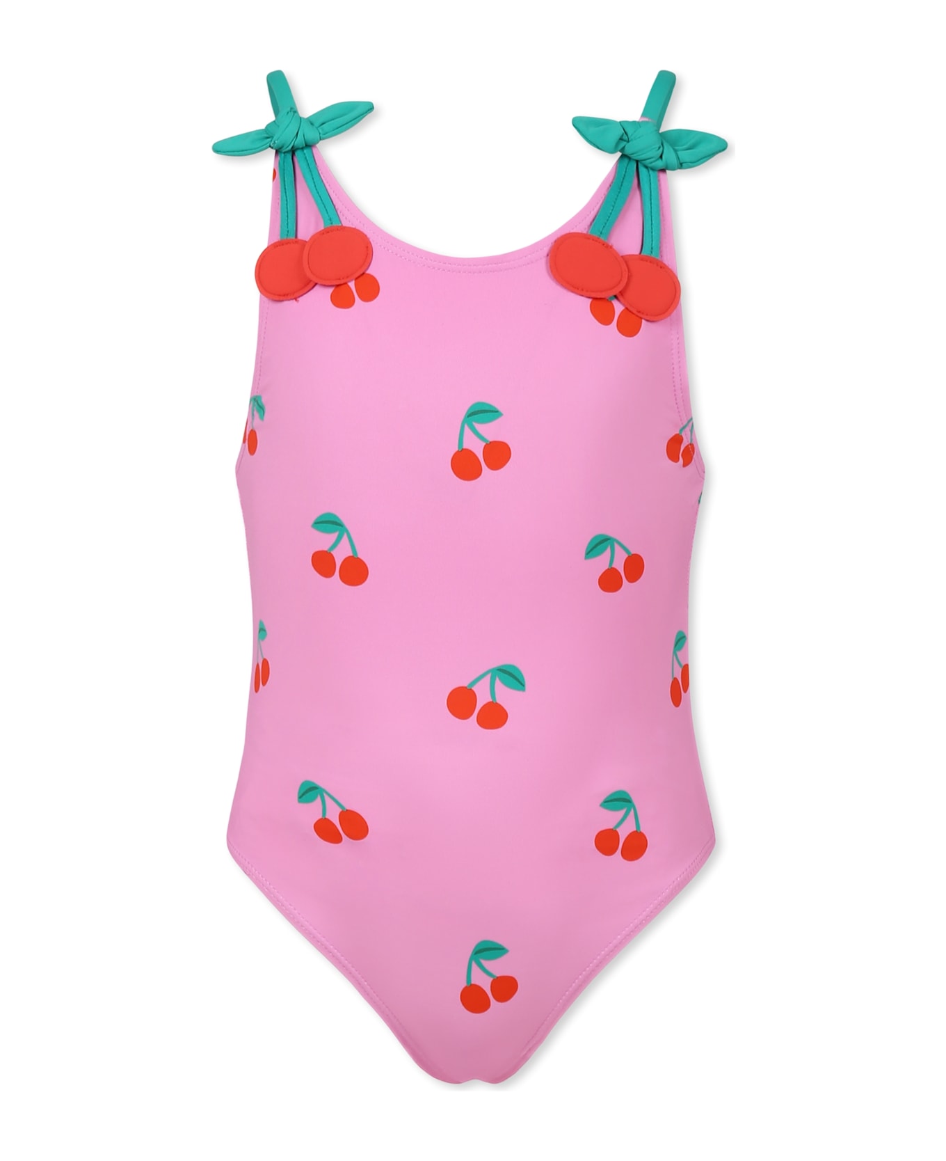 Pink one-piece swimsuit, with shoulder straps and cherry-shaped patches applied on the front; made from recycled materials. It is dembellished with all-over cherries.