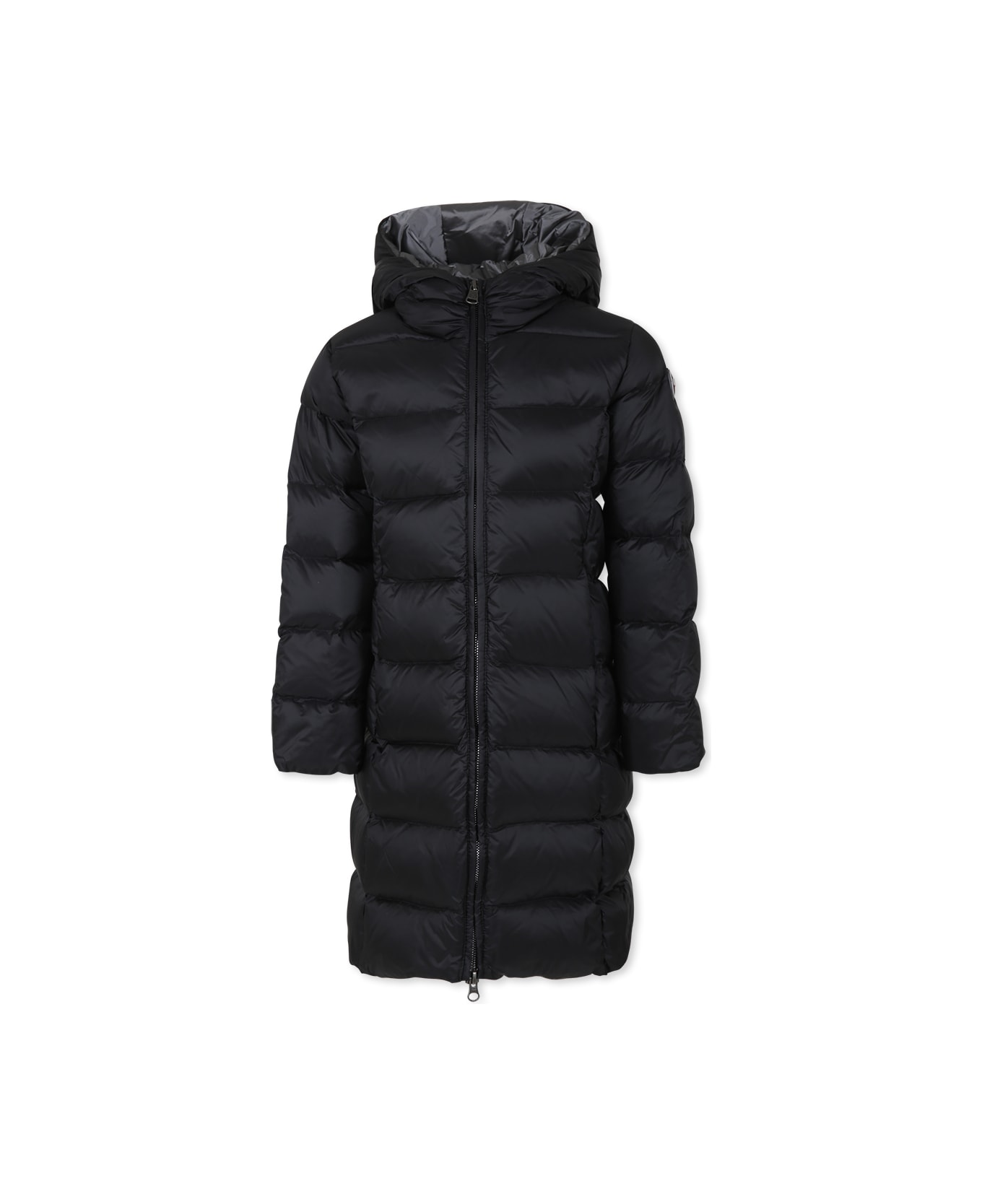 Long black down jacket, lightly padded and quilted, with long sleeves, hood, front zip fastening and side zip pockets. It is embellished with a logo patch on the sleeve and on the back.