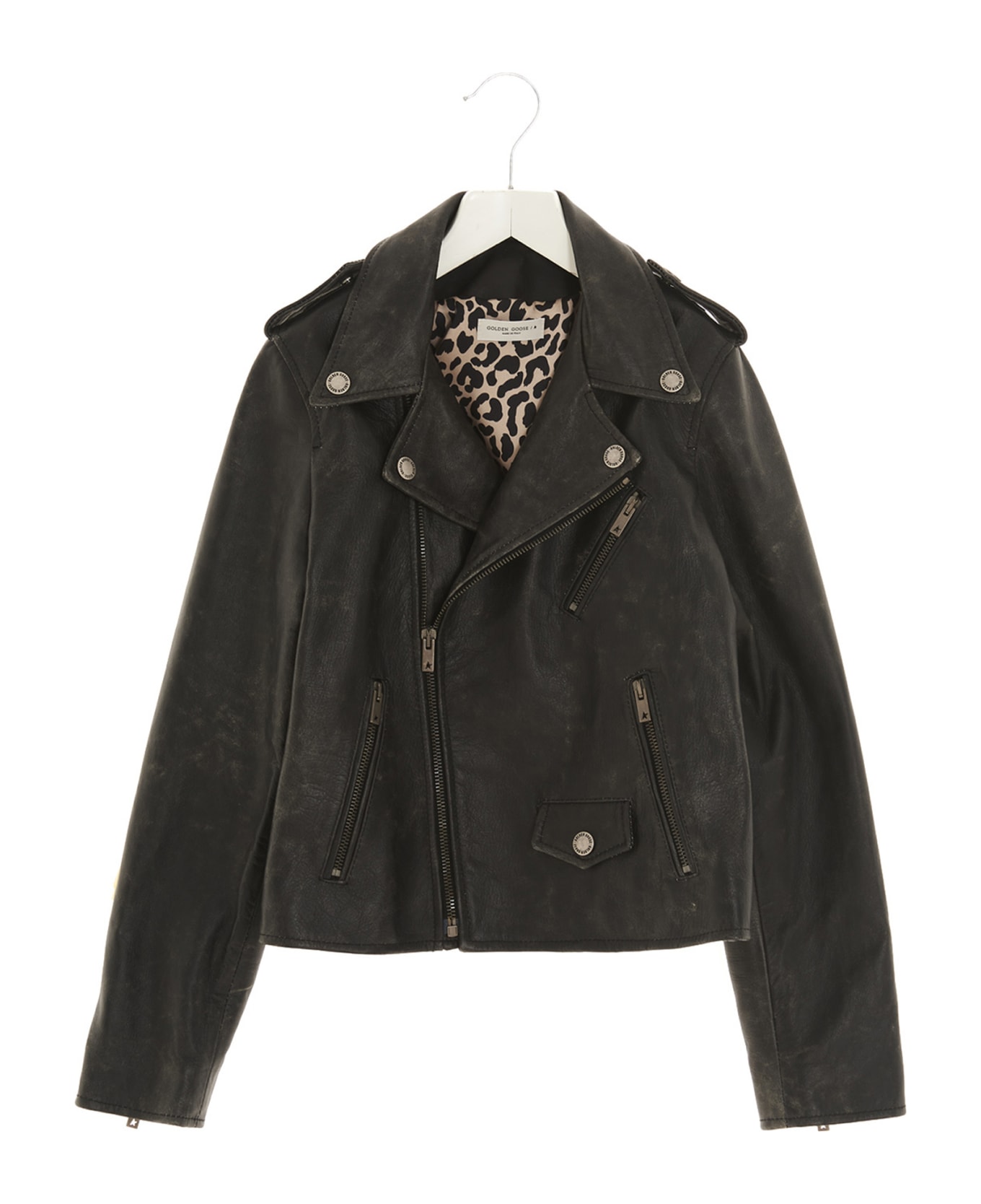 Vintage-effect leather biker jacket, featuring a zip closure, pockets, and long sleeves.
