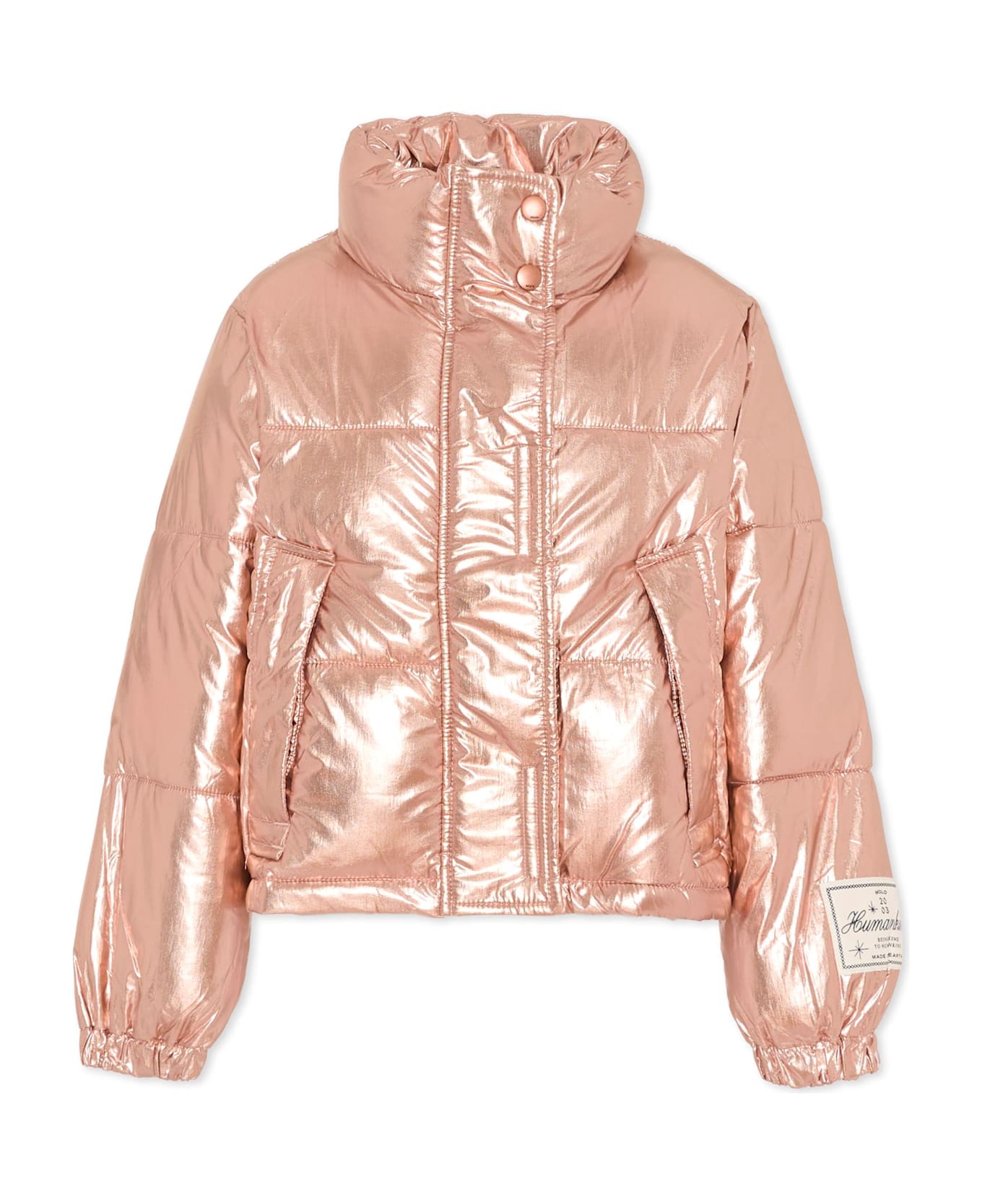 Heavy pink quilted down jacket with a metallic effect, padded and quilted, long sleeves, a crew neck, a front zip fastening, side pockets, elasticated cuffs, and a ribbed hem. It is embellished with a logo patch on one sleeve.