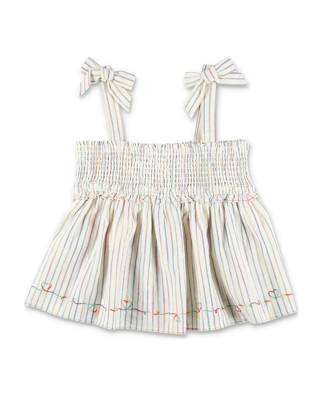 Cotton Rhiannon Denim Top By Zimmermann. Featuring: Denim-like Finish Rainbow Stripes Pattern Fixed Bows On Shoulders Gathered Throughout Contrast Shirred Bodice Embroidery Detail Across Hem