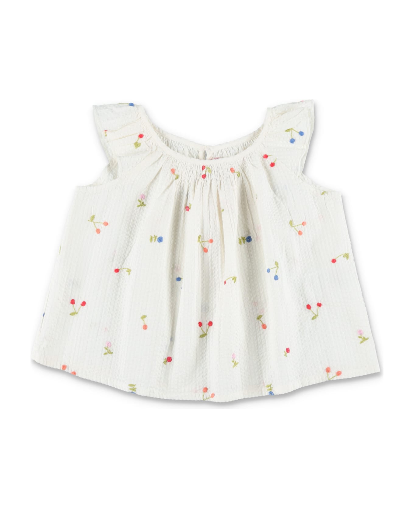 Genia Blouse By Bonpoint. Featuring: Gathered Neckline Ruffled Cap Sleeves Cherry Pattern All Over Button Closure At Back